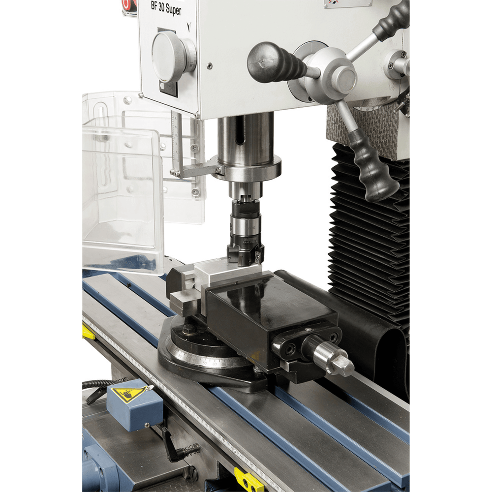 La tavola a croce in ghisa da 700 x 190 mm, con cave a T e scanalatura per refrigerante, offre precisione e stabilità. La testa inclinabile ±45° permette fresature angolari e smussi, mentre i cuscinetti di qualità garantiscono un’elevata concentricità del mandrino.