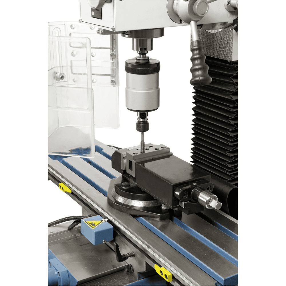Grazie alla testa inclinabile ±90°, alla tavola a croce da 840 x 210 mm con corse 455 x 195 mm e all’avanzamento automatico asse X (AL 350 D) incluso di serie, la macchina assicura versatilità e produttività. Le guide a coda di rondine regolabili sugli assi X, Y e Z e i cuscinetti di precisione con concentricità ≤0,015 mm garantiscono stabilità e accuratezza.