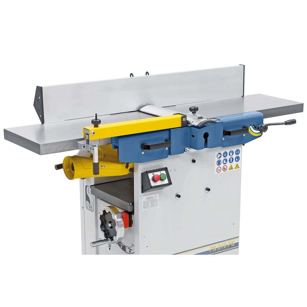 Con un peso di ben 205 kg e i massicci piani superiori in ghisa da 1400 mm, la pialla FS 310 PS assicura stabilità, assenza di vibrazioni e una durata nel tempo superiore. Il motore ad induzione da 3 kW in S1 fornisce potenza costante anche nelle lavorazioni più impegnative, mentre il doppio sistema di apertura dei tavoli di allineamento semplifica l’uso e la regolazione.