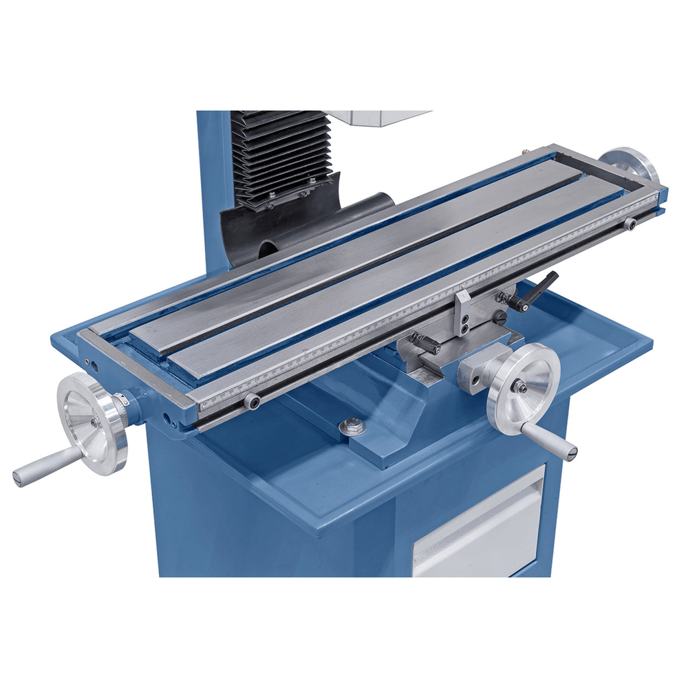 La tavola a croce da 700 x 180 mm con corse di 490 x 150 mm e la testa inclinabile ±90° permettono di eseguire lavorazioni angolari e smussi in modo semplice e preciso. Il motore a corrente continua fornisce coppia ottimale anche a bassi regimi, mentre le guide a coda di rondine su X, Y e Z, regolabili con lardoni, garantiscono stabilità.