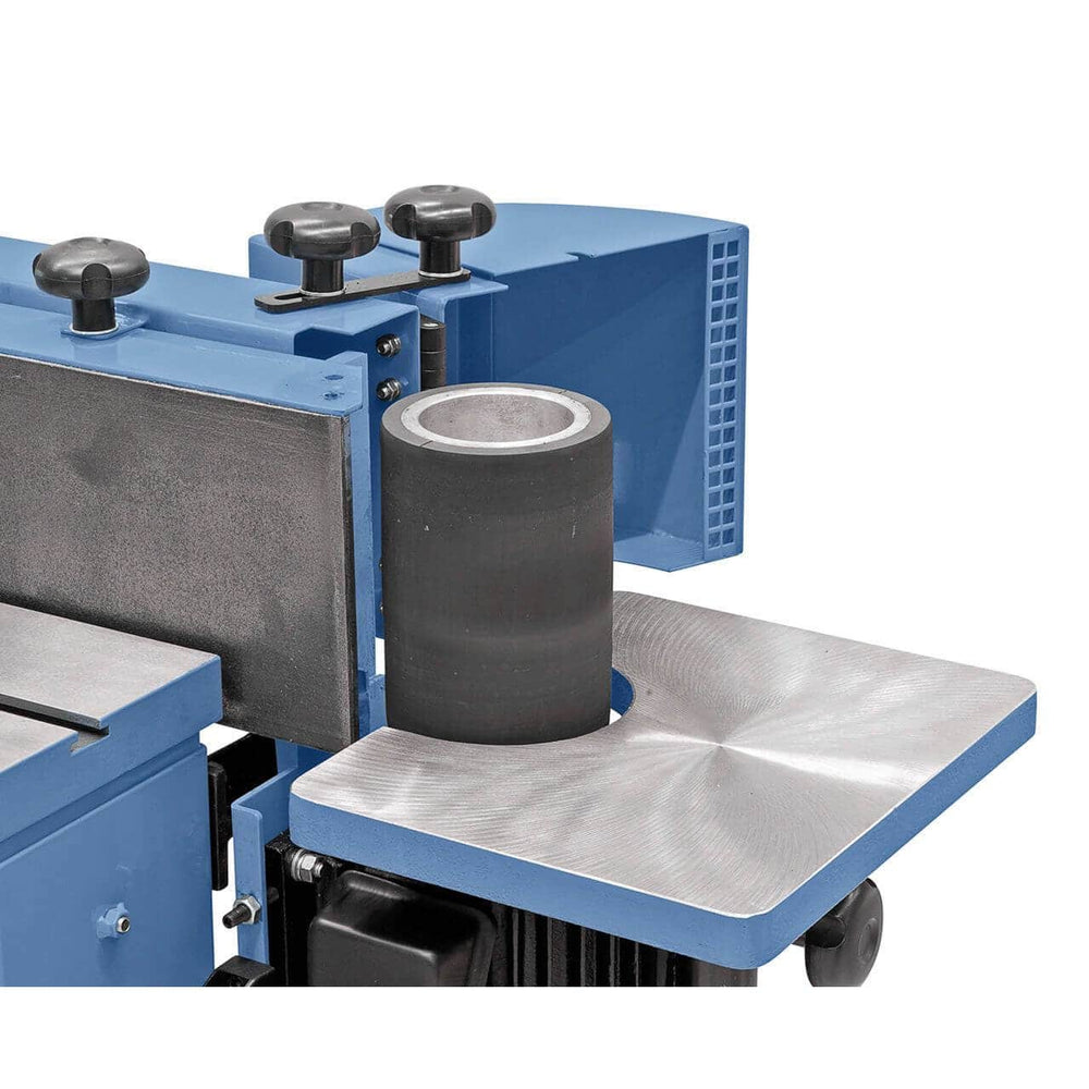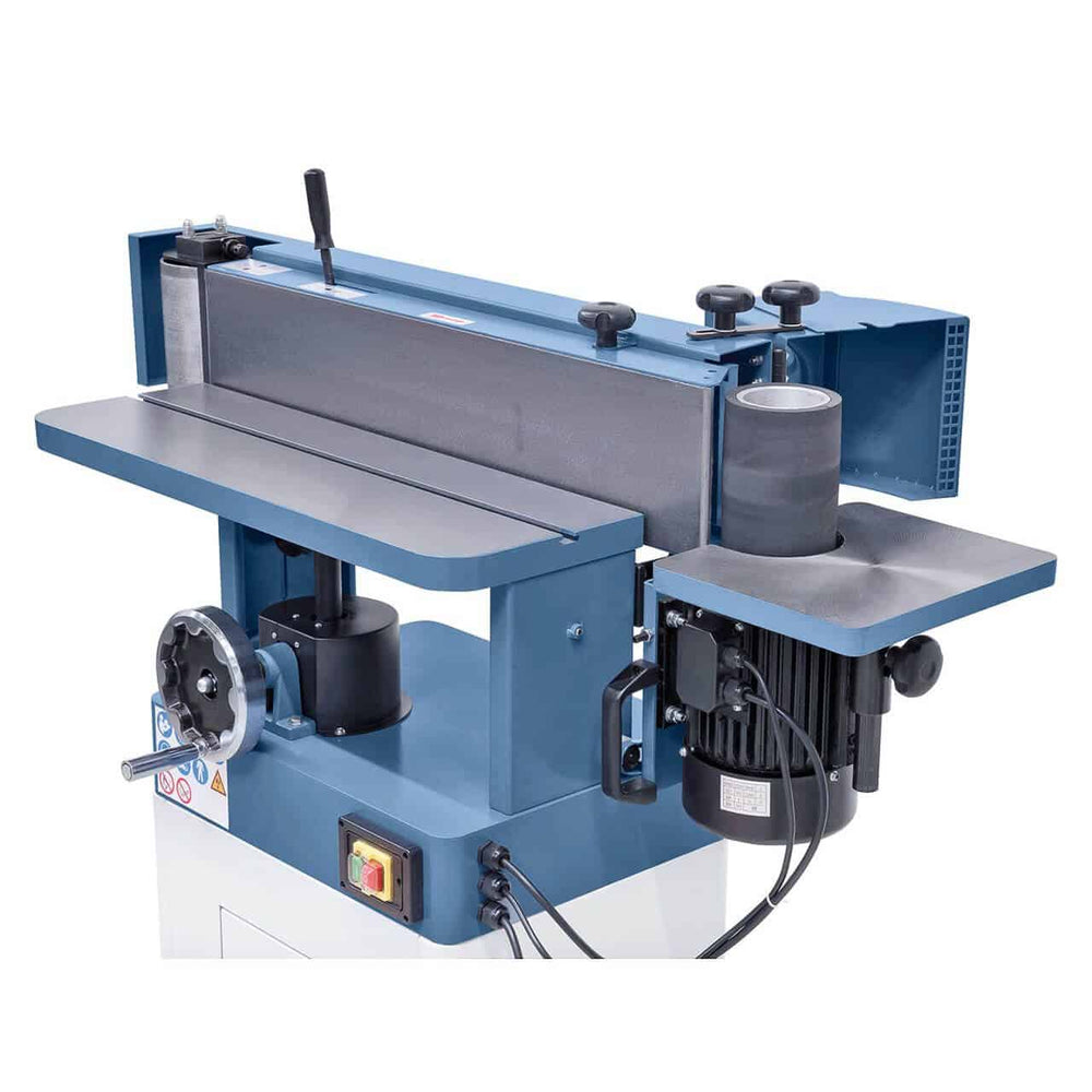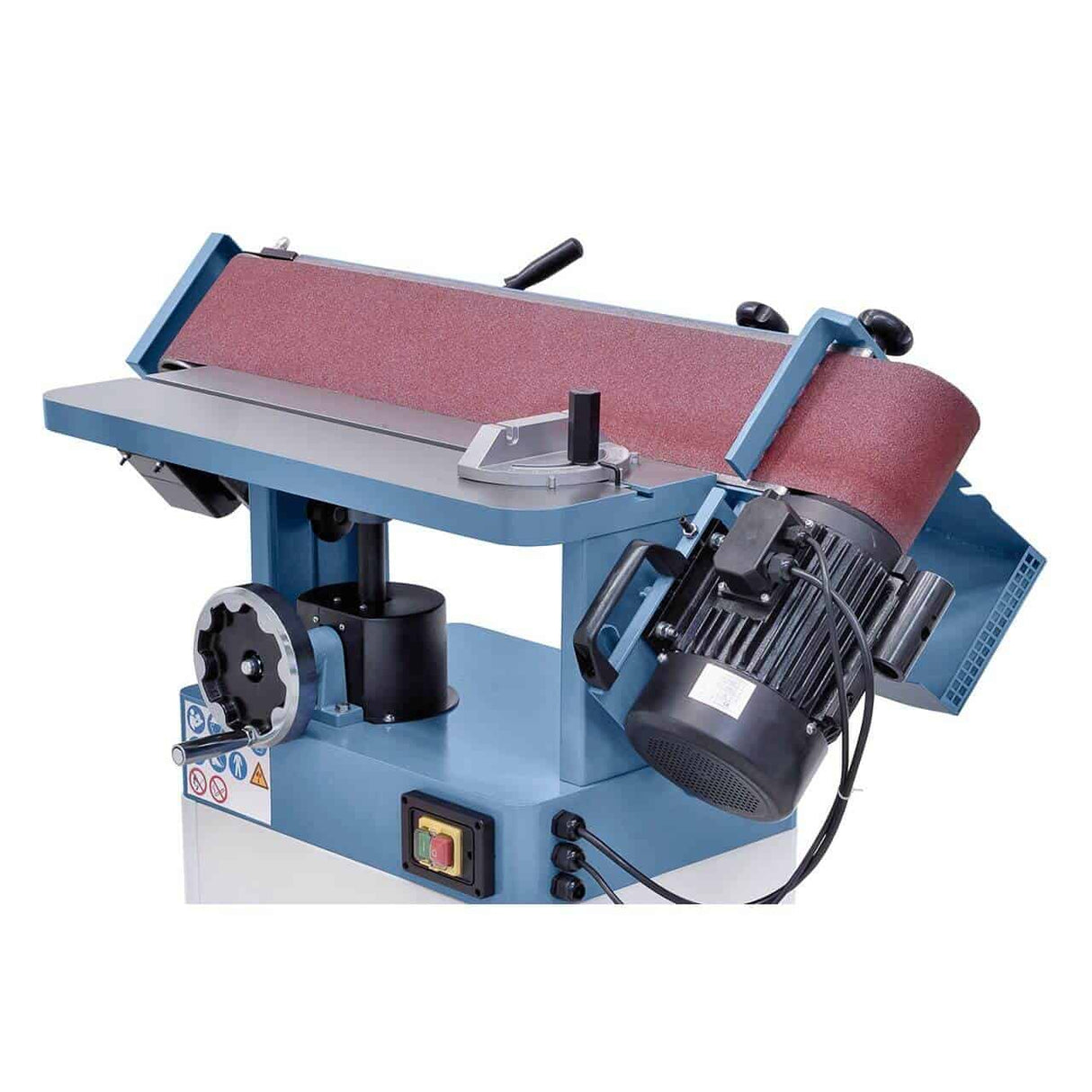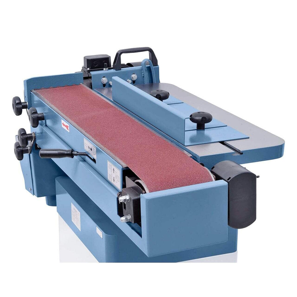 Nastro 2260×150 grana 60, tavolo ausiliario, rivestimento grafite, squadra mitra, barra di arresto, rullo gommato e stand con vano utensili.