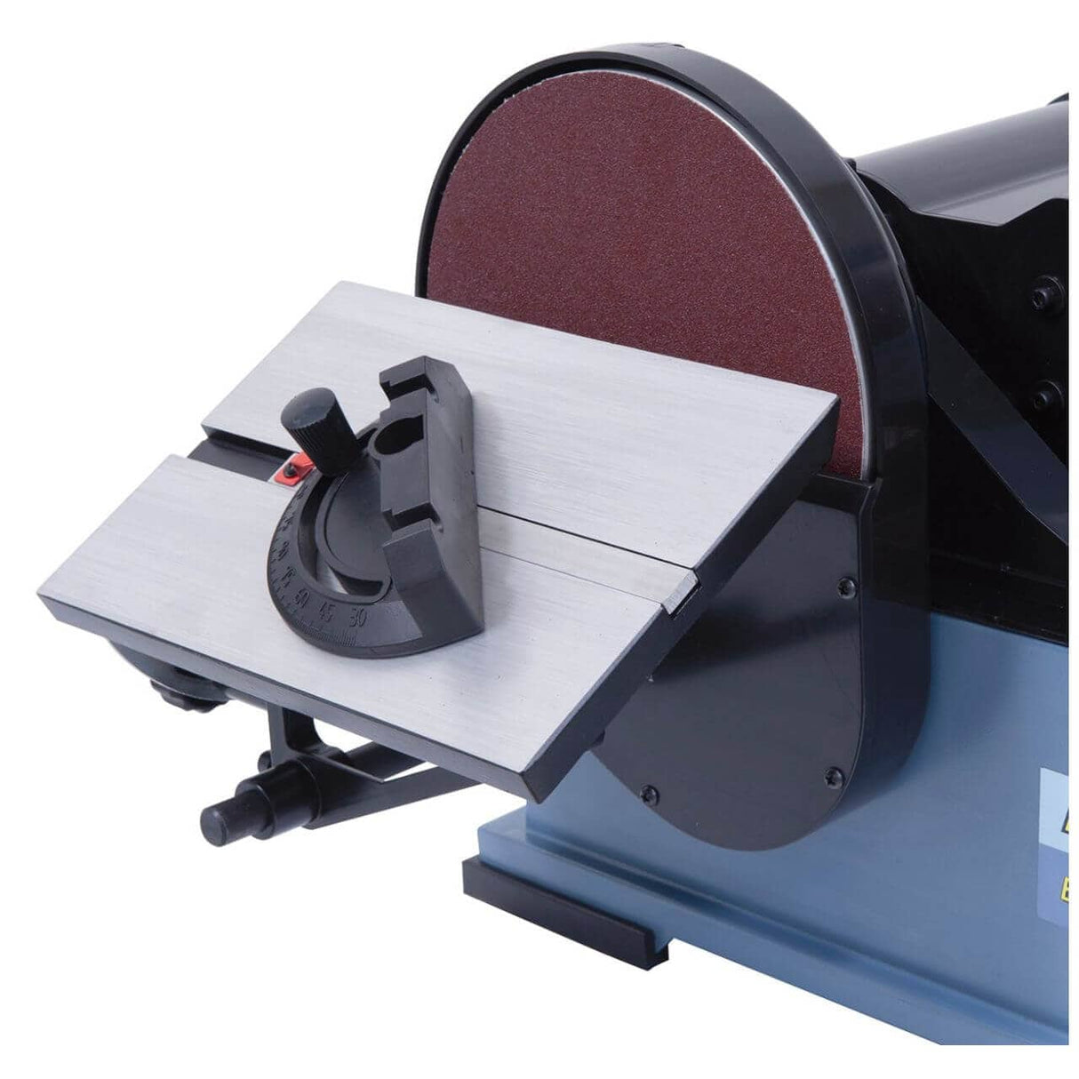 Disco Ø 230 mm con tavolo 260 × 175 mm inclinabile 0°–45°; il piano è sotto il centro per sfruttare tutto il disco.