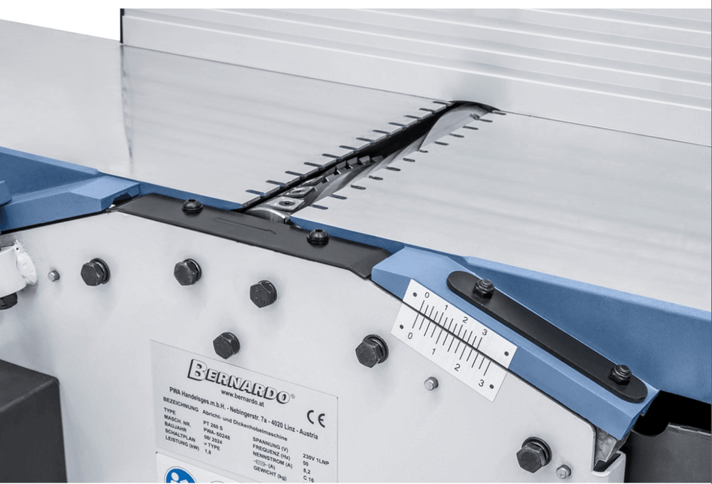 La pialla filo e spessore Bernardo PT 260 S è una macchina professionale compatta che unisce potenza, precisione e praticità. Dotata di albero elicoidale con 24 inserti TCT in metallo duro, riduce il rumore fino al 50% rispetto alle lame HSS tradizionali e garantisce una finitura superiore. Gli inserti sono reversibili e sostituibili singolarmente, ottimizzando i costi di manutenzione. Le tavole di piallatura in alluminio con fessure antirumore e la guida inclinabile da 90° a 45° assicurano stabilità e versatilità. La funzione spessore è guidata su 4 colonne, per un avanzamento uniforme fino a 150 mm di altezza. Completa di aspiratore integrato e sacco raccoglipolvere, offre un ambiente di lavoro più pulito e sicuro. Una soluzione ideale per falegnami, hobbisti e piccoli laboratori che cercano efficienza e ottimo rapporto qualità/prezzo.