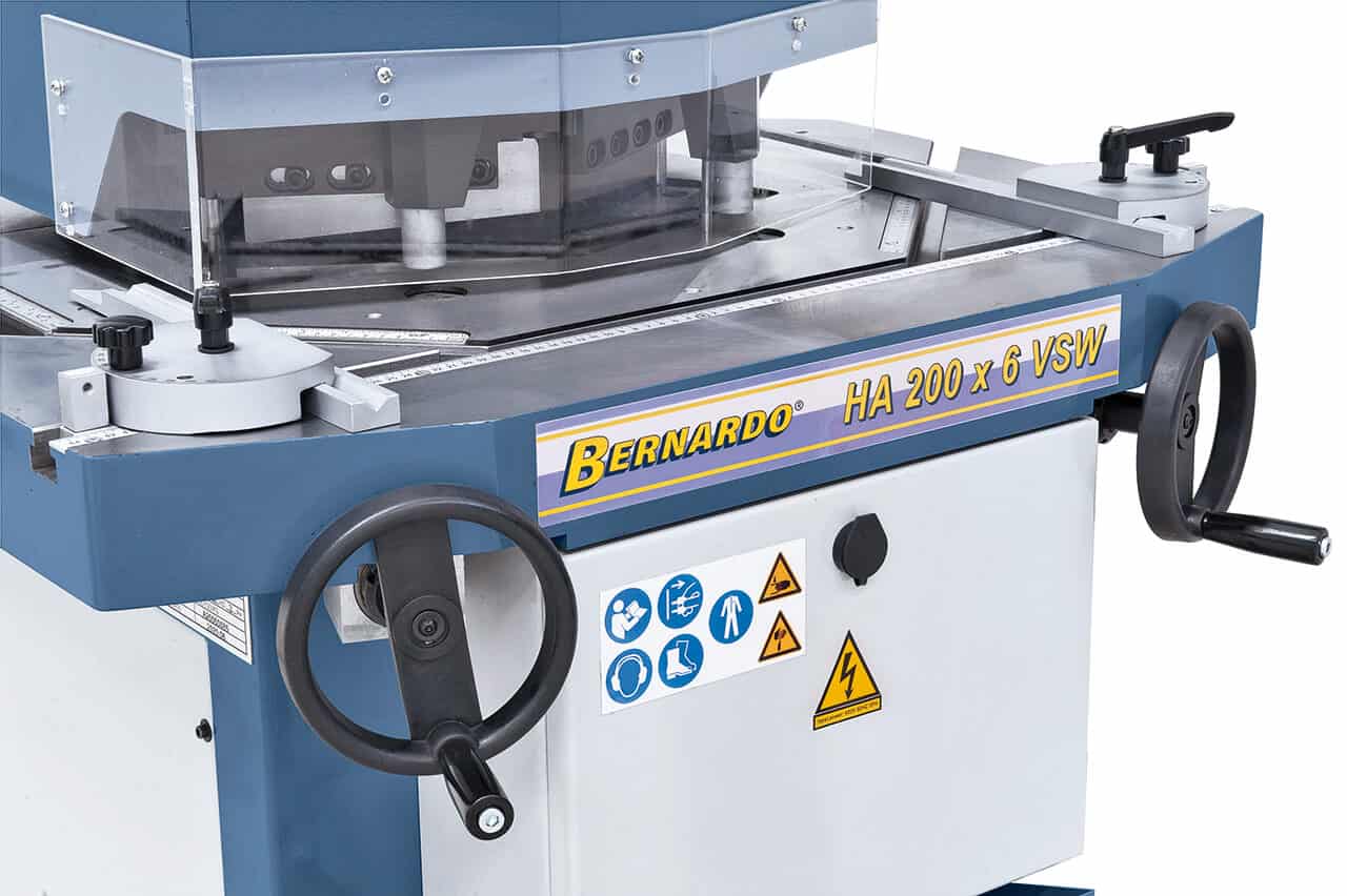 La Bernardo Scantonatrice idraulica HA 200 x 6 VSW ĆØ una macchina versatile e robusta, progettata per il taglio angolare e la punzonatura di lamiere. Consente di lavorare spessori fino a 6 mm (400 N/mm²) e 3 mm su materiali con resistenza a 600 N/mm². Grazie alla corsa di 24 colpi/minuto e allāangolo di taglio regolabile da 30° a 140°, offre grande flessibilitĆ e precisione nelle lavorazioni. La tavola da 900 x 990 mm con altezza 940 mm garantisce ampio spazio operativo. LāunitĆ di punzonatura integrata permette fori fino a Ć 35 mm su spessori di 6 mm, ampliando il campo di utilizzo della macchina. Dotata di motore da 4,0 kW/400 V e struttura da oltre 1000 kg, assicura stabilitĆ e lunga durata. Con dispositivi di sicurezza e accessori standard inclusi, rappresenta una soluzione completa per officine e carpenterie metalliche.