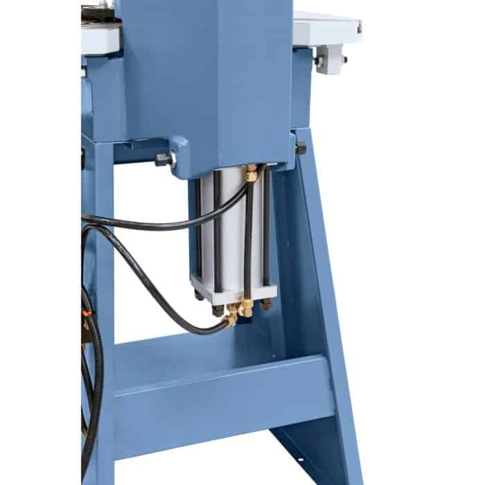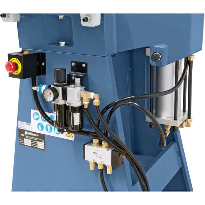 La Bernardo Scantonatrice pneumatica AK 150 P è una macchina compatta e precisa per la lavorazione di lamiere sottili. Con una capacità di taglio fino a 2 mm (400 N/mm²) e 1 mm per acciaio inox (con set coltelli opzionale), garantisce scantonature nette e senza sbavature. La lunghezza massima di taglio a 90° è di 150 x 150 mm, con angolo fisso. La pressione di taglio raggiunge 2,2 tonnellate, con una frequenza di 40 colpi/minuto, ideale per lavorazioni leggere e medie in carpenteria. La tavola di lavoro da 600 x 460 mm e il telaio compatto (170 kg) offrono stabilità e praticità. L’azionamento avviene tramite pedale pneumatico, che mantiene le mani libere per il posizionamento del materiale. Dotata di protezione in plexiglass e fornita di serie con coltelli, guide orientabili e goniometro, rappresenta una soluzione versatile e sicura per officine e scuole.