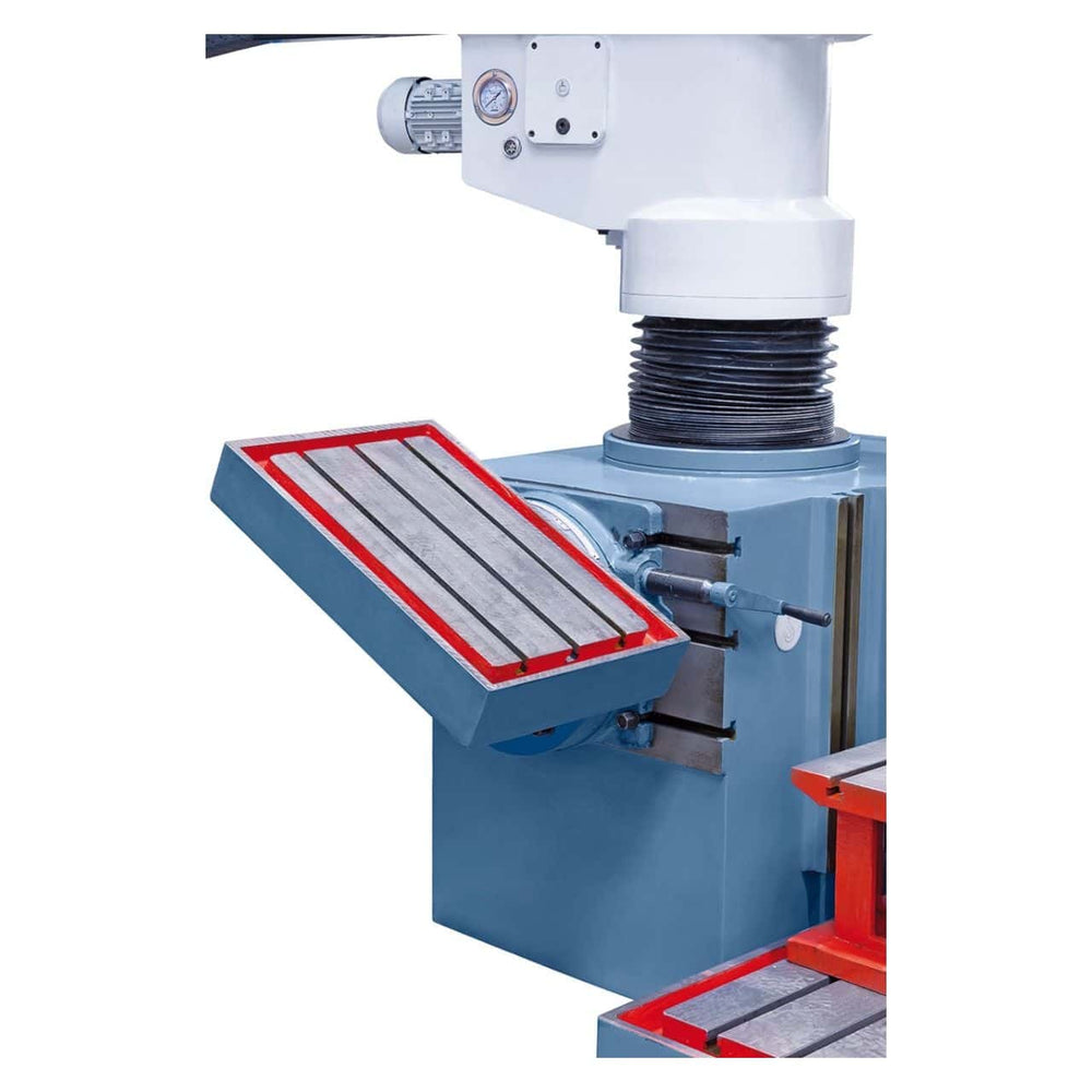 La costruzione robusta con colonna da à 220 mm e braccio radiale rigido assicura lavorazioni prive di vibrazioni. La testa è regolabile elettromotorizzata in altezza, inclinabile da -90° a +90° e dotata di serraggio idraulico, ideale anche per forature profonde.