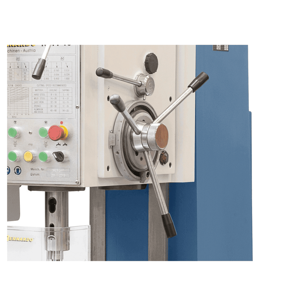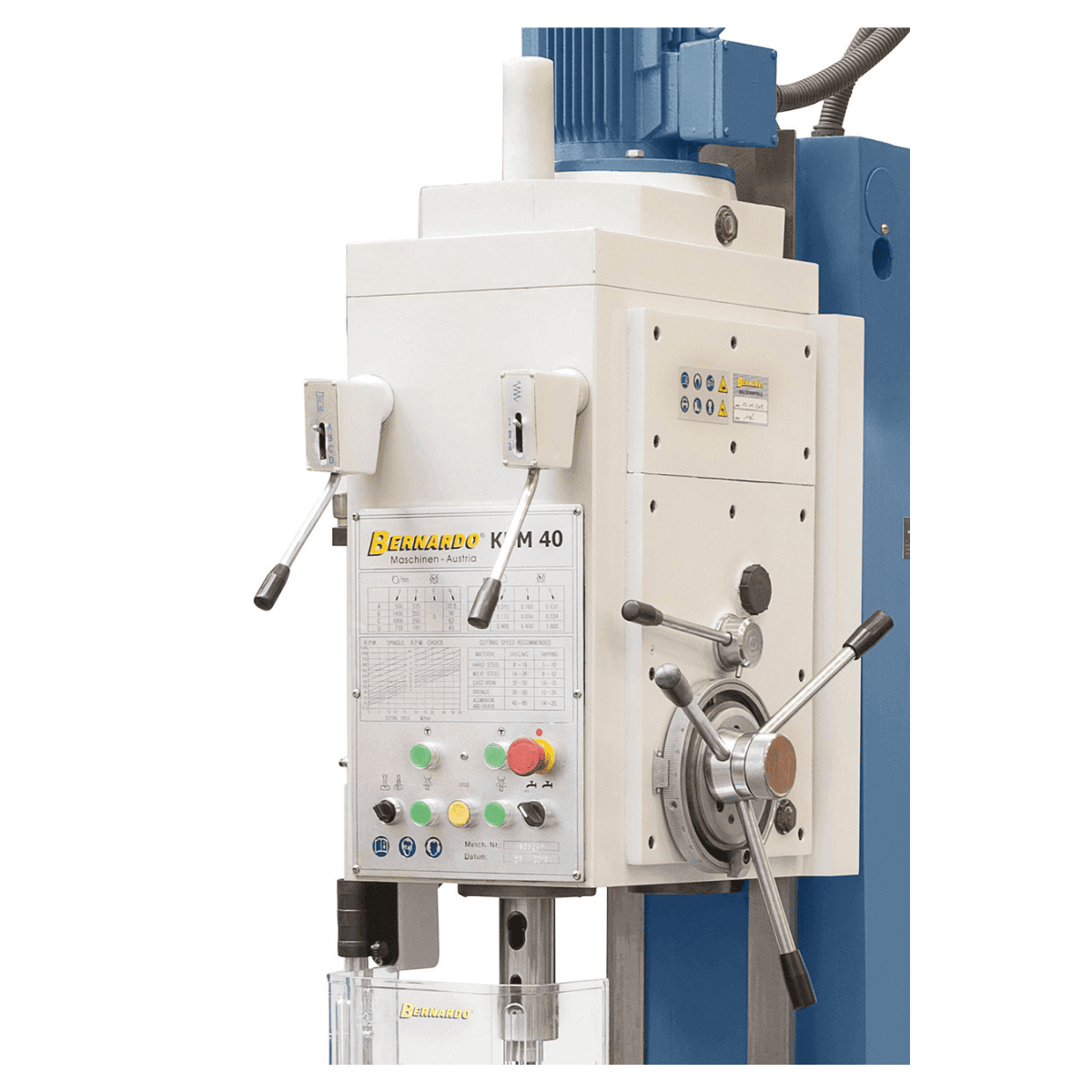 Il Bernardo Trapano a colonna fissa KBM 25 è una macchina robusta e compatta, ideale per officine e produzioni meccaniche che necessitano di precisione e affidabilità. Con capacità di foratura fino a 25 mm in acciaio e filettatura fino a M16, garantisce prestazioni versatili e sicure. La struttura in ghisa massiccia e le guide a coda di rondine regolabili assicurano stabilità e lunga durata. Il motore da 2,2 kW eroga una coppia di 160 Nm e una forza di avanzamento fino a 9.000 N. Il mandrino dispone di avanzamento automatico con 9 gamme e velocità regolabili da 50 a 2000 giri/min. Dotato di dispositivo di filettatura con inversione automatica, luce LED integrata, refrigerante e protezioni di sicurezza, il KBM 25 rappresenta una soluzione affidabile per lavorazioni industriali di media capacità.