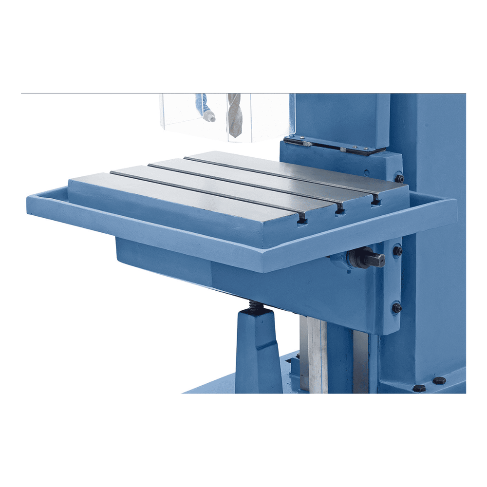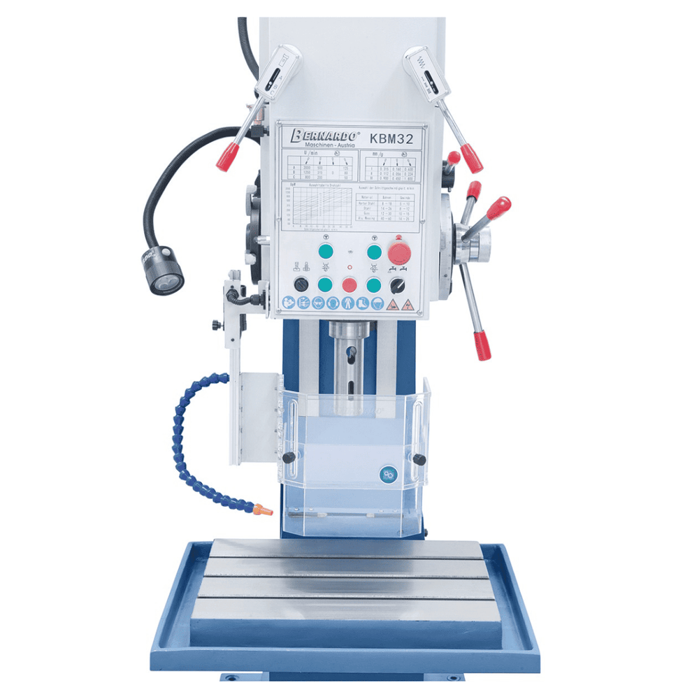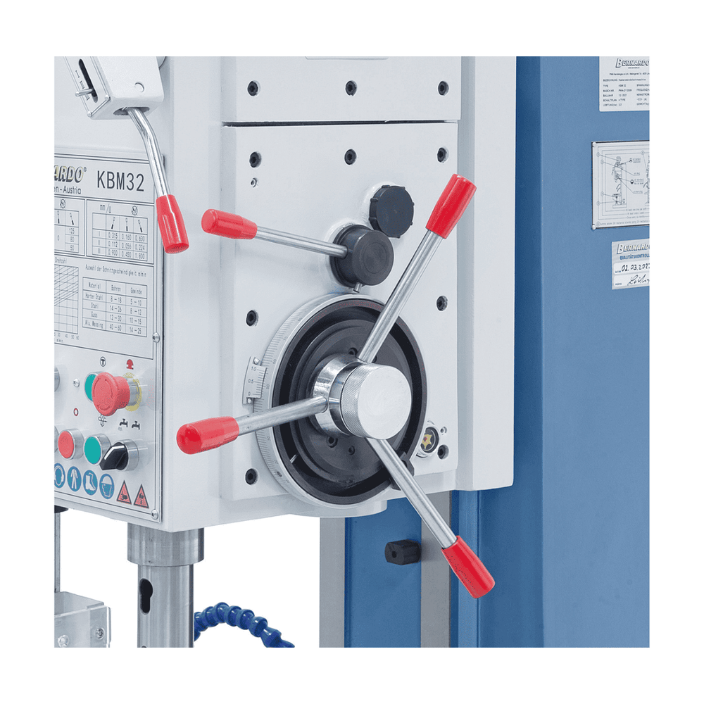 Il Bernardo Trapano a colonna fissa KBM 32 è una macchina robusta e compatta, progettata per lavorazioni professionali e industriali di media capacità. Con una capacità di foratura fino a 32 mm in acciaio e filettatura fino a M22, offre prestazioni affidabili e grande versatilità. La struttura in ghisa massiccia e le guide a coda di rondine regolabili garantiscono stabilità e precisione durante l’uso. Il motore da 2,2 kW eroga una coppia di 160 Nm con forza di avanzamento fino a 9.000 N. Il mandrino dispone di avanzamento automatico con 9 gamme di avanzamento e velocità variabili da 50 a 2000 giri/min (9 passi). Completo di dispositivo di filettatura con inversione automatica, lampada LED, refrigerante e protezioni, il KBM 32 rappresenta una soluzione efficiente e sicura per officine e reparti produttivi.