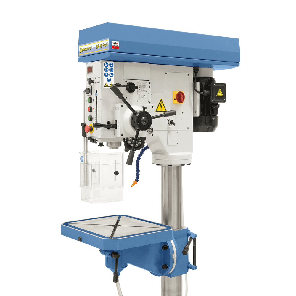 Il Bernardo Trapano a colonna SB 40 Profi è progettato per garantire precisione e robustezza nelle lavorazioni professionali in officina. Grazie al sistema Vario-drive, offre una regolazione continua della velocità (90 – 1455 rpm) leggibile sul display digitale integrato, permettendo un controllo ottimale in base al materiale lavorato. L’avanzamento del mandrino può essere manuale o automatico, con tre passi di avanzamento (0,1 / 0,2 / 0,3 mm/giro) per massima precisione. Il solido piano in ghisa inclinabile da -50° a +50°, dotato di cave a T e scanalature di raffreddamento, assicura stabilità e versatilità. Incluso di serie: pompa refrigerante, lampada LED e dispositivo di sgancio automatico utensile. Con una capacità di foratura fino a Ø 40 mm e un motore da 1,5 kW, il SB 40 Profi è la scelta ideale per officine, carpenterie e lavorazioni professionali.