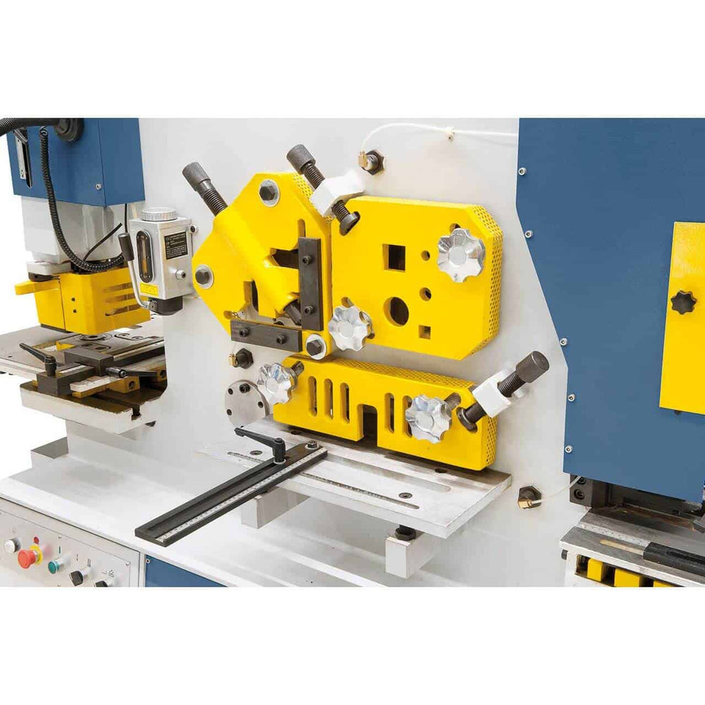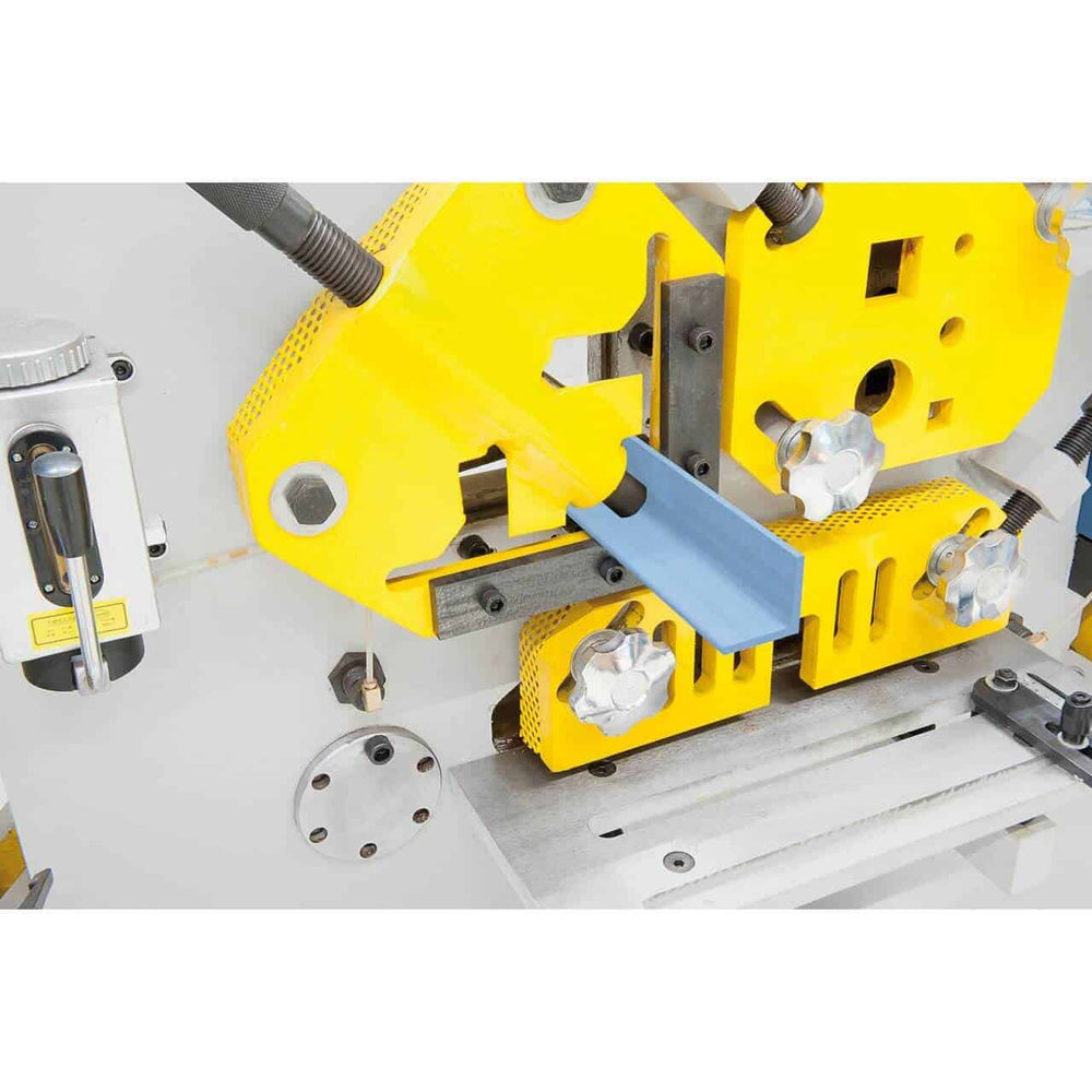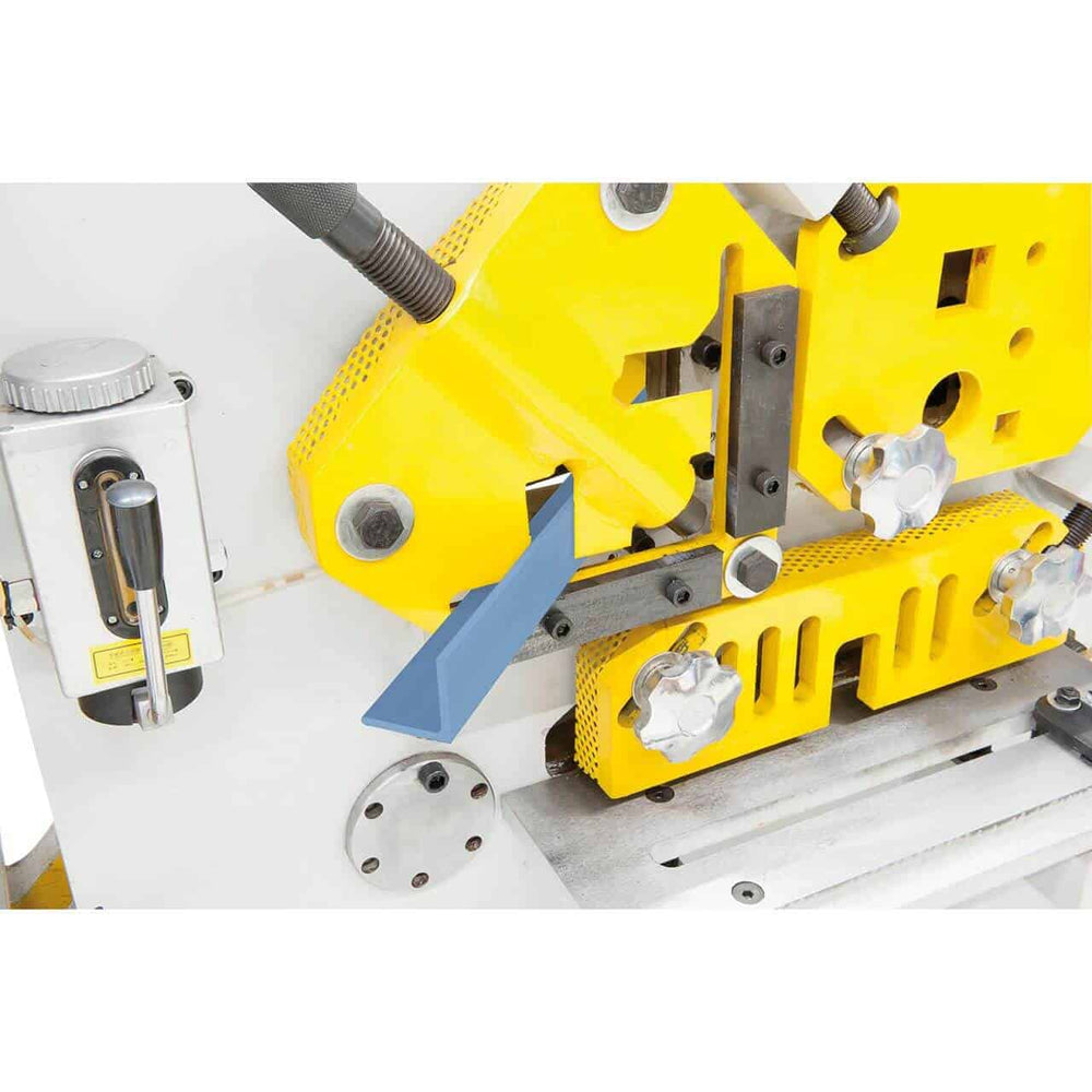La cesoia idraulica Bernardo HPS 60 è una macchina multifunzione progettata per la lavorazione professionale di acciai e profilati. Con una forza di punzonatura di 60 tonnellate, consente di realizzare fori fino a 25 mm di diametro su spessori di 16 mm, ampliabili a 50 mm con accessori opzionali. Grazie alle sue stazioni operative, è in grado di tagliare piatti in acciaio fino a 330 mm di larghezza, profili angolari, barre tonde e quadre, oltre a profili a T, U e I. La stazione di intaglio integrata consente di eseguire intagli rettangolari e triangolari su materiali fino a 16 mm di spessore. Con un motore da 4 kW e una struttura solida da 1600 kg, la HPS 60 offre potenza, precisione e lunga durata. È la scelta ideale per carpenterie metalliche, officine meccaniche e aziende che necessitano di una macchina robusta e versatile.