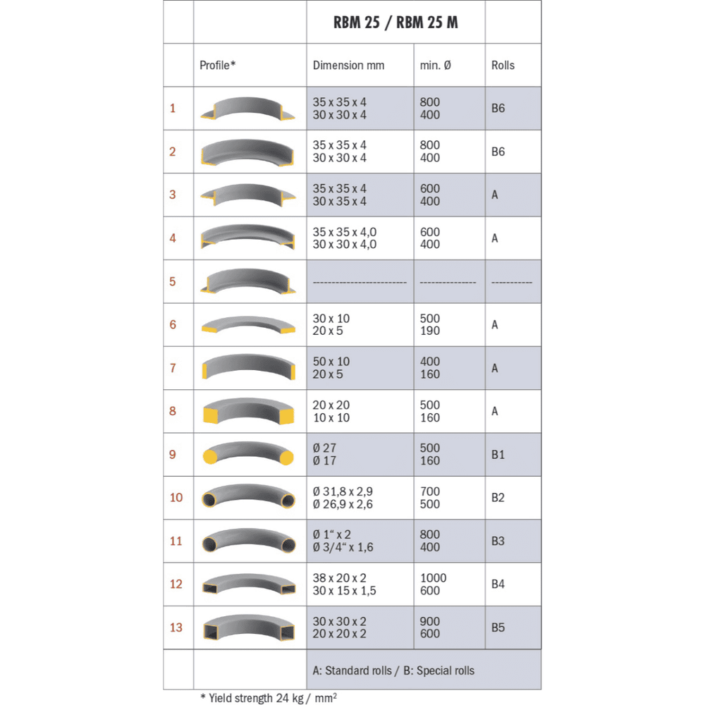 • Set di rulli standard incluso per la curvatura di profili quadrati