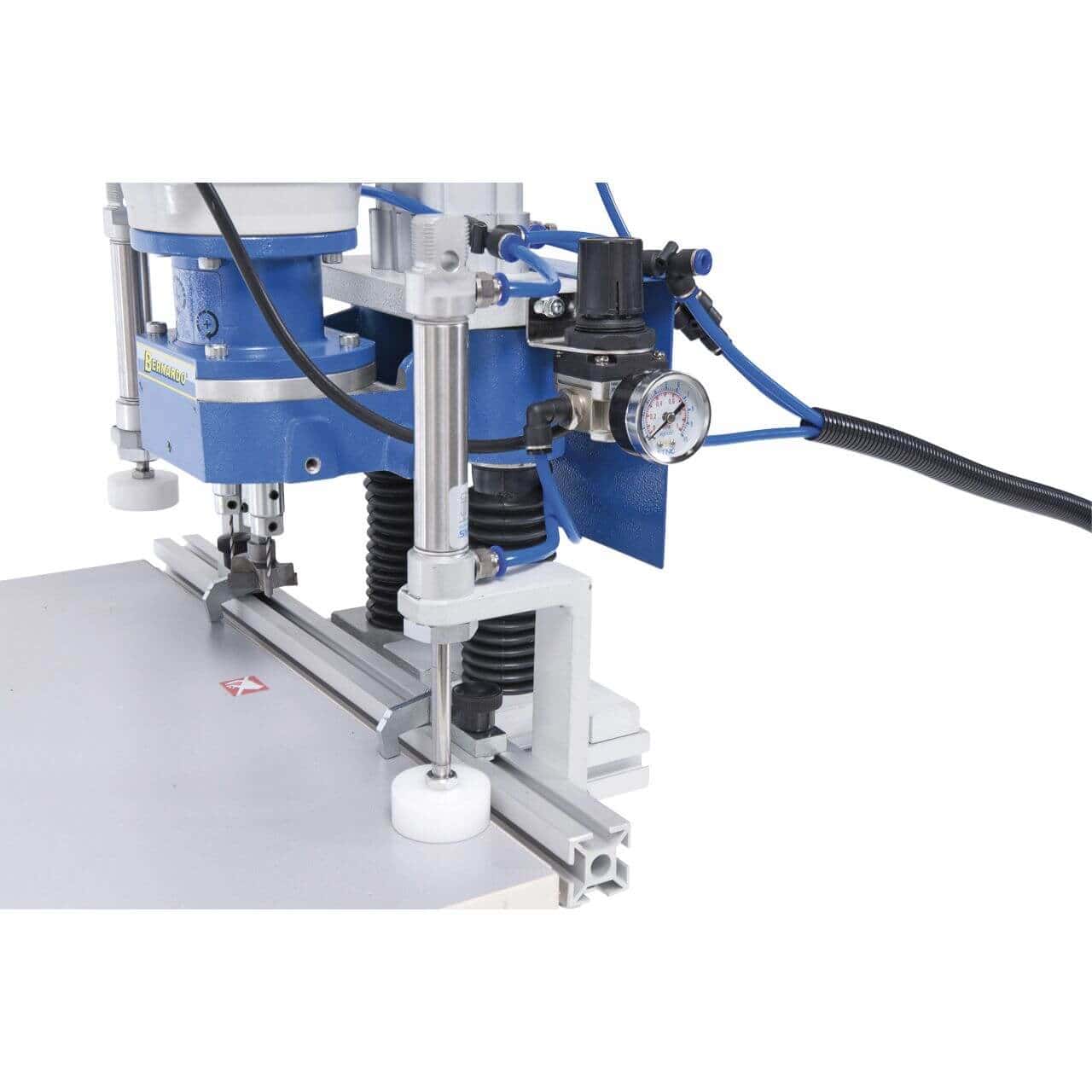 La BBM 35 P ĆØ una foratrice professionale con avanzamento pneumatico, progettata per la realizzazione precisa e veloce di fori per cerniere Grass e Blum. Ideale per falegnami e piccole aziende, consente operazioni in serie grazie alla sua guida lunga da 1,5 metri e al bloccaggio pneumatico del pezzo.