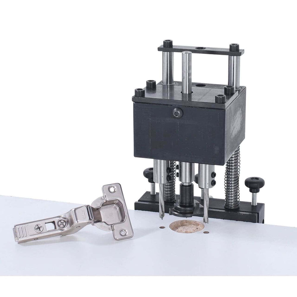 La maschera per la foratura di cerniere di tipo Fiore o di tipo Erba ha tre mandrini ed è adatta all'esecuzione dei tre fori per il fissaggio delle cerniere contemporaneamente.