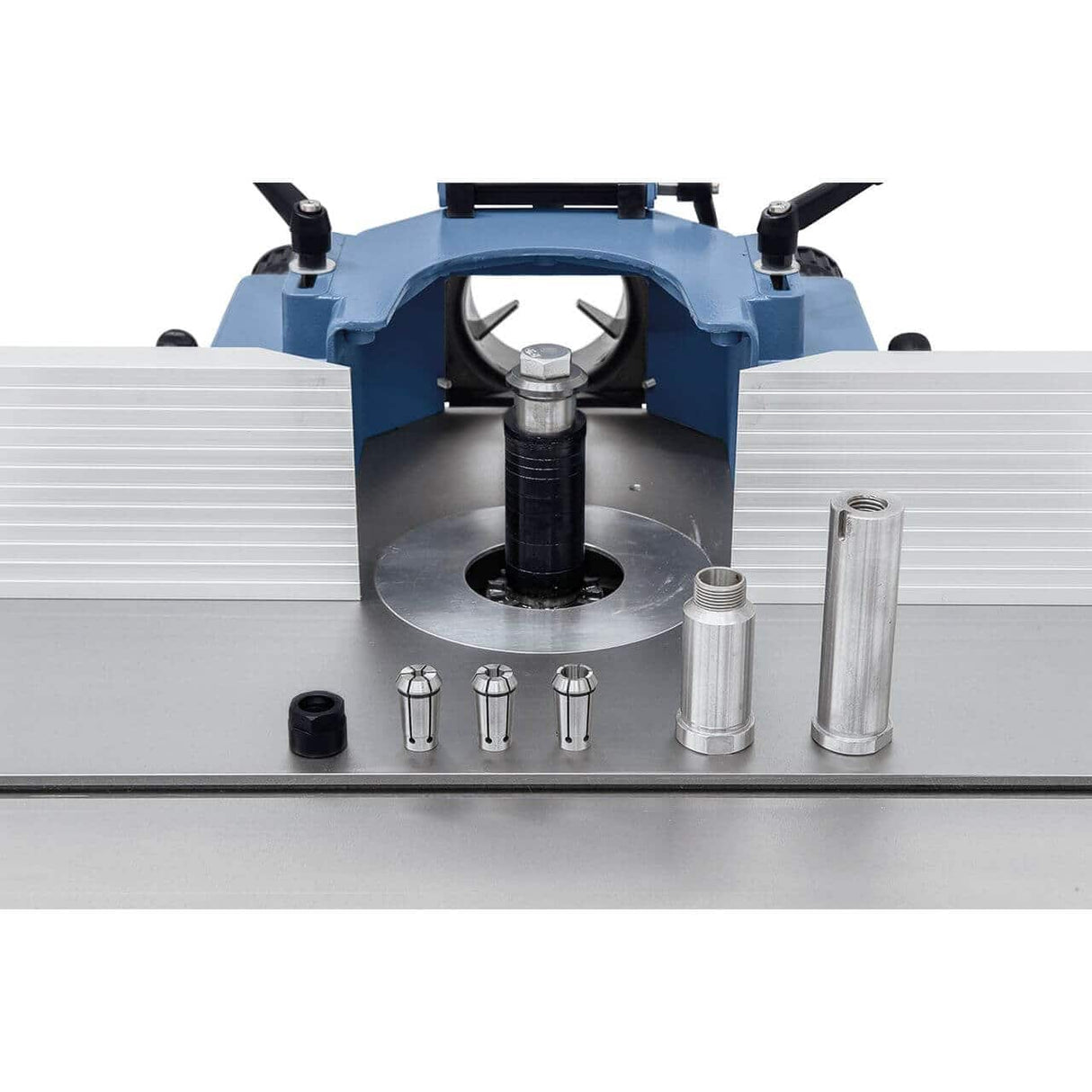 Puoi utilizzare utensili con diametro fino a 200 mm per lavorazioni esterne e fino a 95 mm per lavorazioni sotto tavola. Sono incluse pinze per frese terminali da 6, 8 e 12 mm.