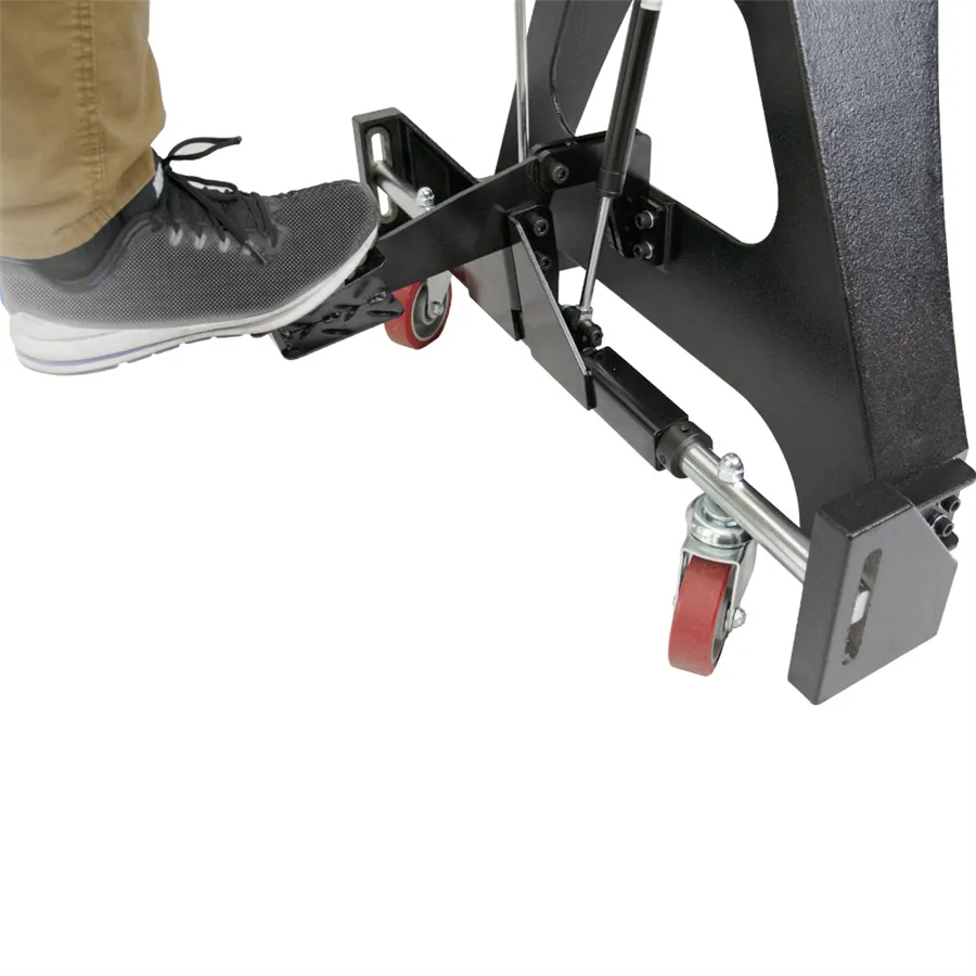 È sufficiente premere con il piede sull’asta di attivazione per sollevare il tornio e renderlo mobile. Il sistema è semplice e intuitivo.