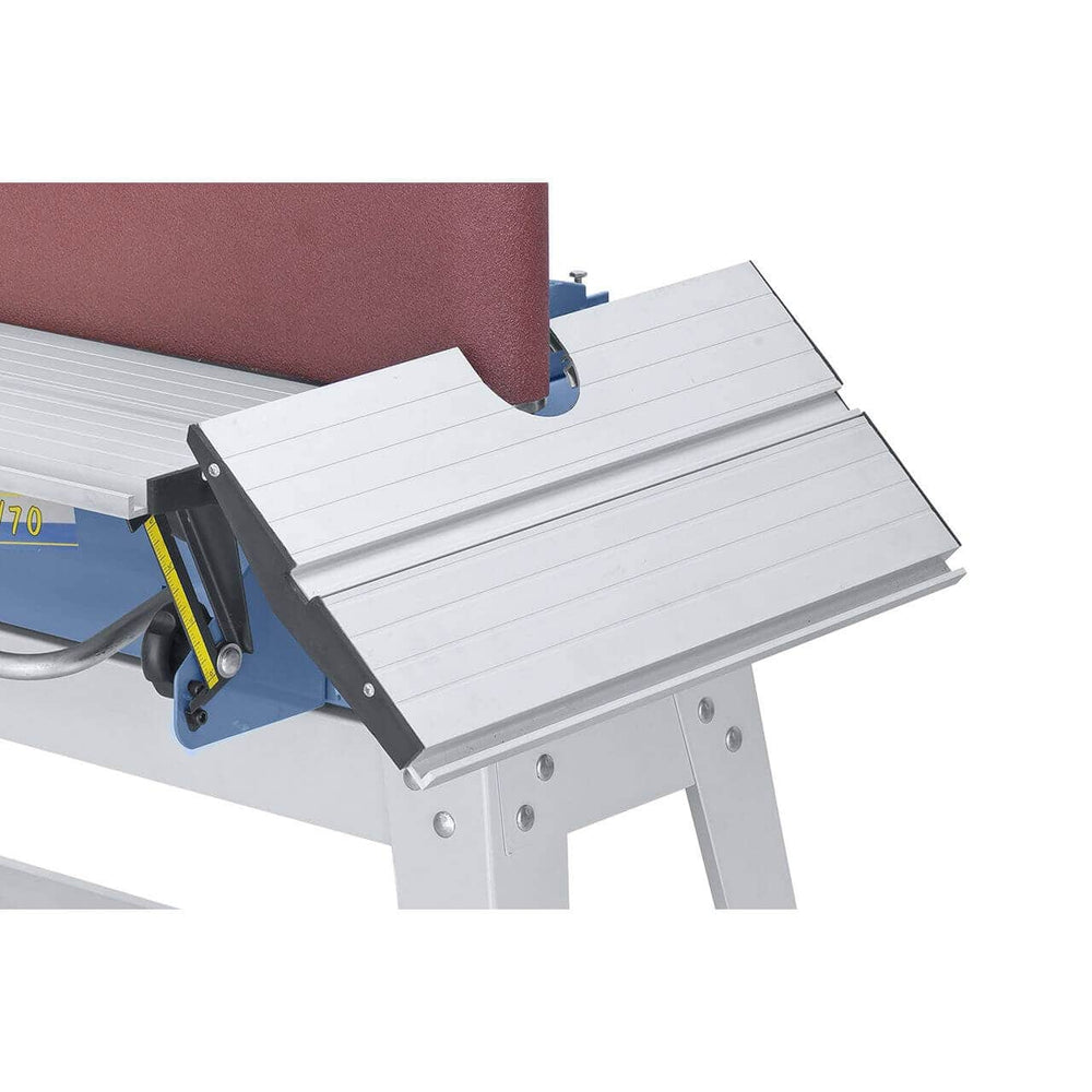 Dotata di due tavoli inclinabili (0°–45°) e di supporto regolabile per sagome e profili, permette lavorazioni accurate anche su pezzi complessi. Il rivestimento in grafite sul piano migliora lo scorrimento del nastro abrasivo, riducendo l’usura e garantendo una levigatura più uniforme.