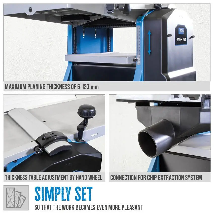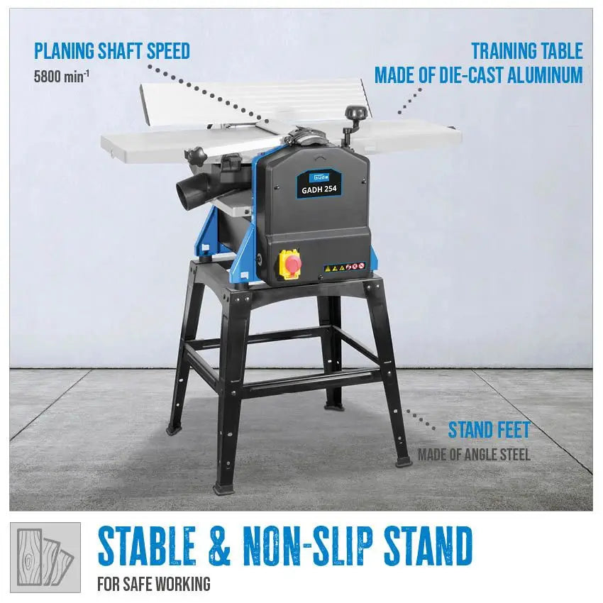 La Guede GADH 254 è una pialla filo e spessore combinata progettata per offrire prestazioni precise e costanti, ideale per hobbisti evoluti e artigiani. I piani di piallatura in alluminio pressofuso con fresatura longitudinale assicurano superfici perfettamente piane, mentre la regolazione dello spessore con volantino consente di lavorare pezzi da 6 a 120 mm con estrema precisione. Il fermo parallelo inclinabile 0°–45°, la protezione dell’albero pialla e gli interruttori di sicurezza con rilascio a tensione zero garantiscono affidabilità e sicurezza. Il potente motore da 1500 W e le 2 lame HSS assicurano risultati puliti e professionali su ogni tipo di legno.