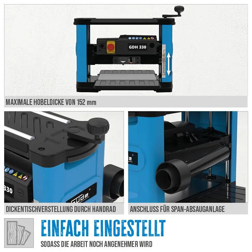 Dotata di bocchetta per aspirazione trucioli, indicatore di profondità di taglio e rulli di ritorno pezzo, la GDH 330 unisce precisione e comfort d’uso. Le maniglie integrate facilitano il trasporto, rendendola perfetta per hobbisti esigenti e artigiani professionisti.