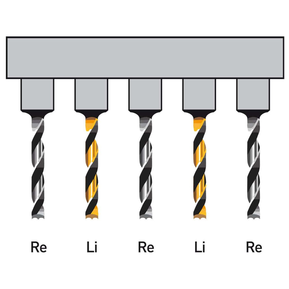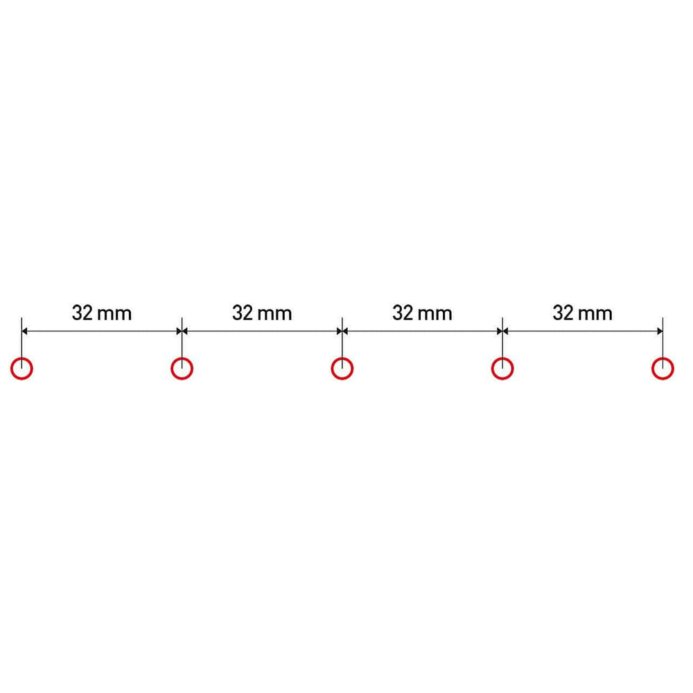 Questa testa di foratura di serie è dotata di cinque mandrini, per eseguire una serie di cinque fori allo stesso tempo con un interasse di 32 mm. Questa apparecchiatura è utilizzata per la foratura di pannelli laterali di mobili, nonché per fissare la base della cerniera.
