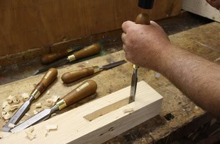 Utensile speciale per lavori grossolani. La lama si assottiglia in larghezza e in lunghezza, dalla punta alla spalla, per garantire il gioco delle pareti laterali. La lama forgiata è realizzata in acciaio tradizionale al Cr-Mn e trattata termicamente a 59 HRc. L'impugnatura ergonomica, realizzata in legno di carpino duro e pesante, è sufficientemente robusta da resistere a colpi pesanti di mazzuolo.