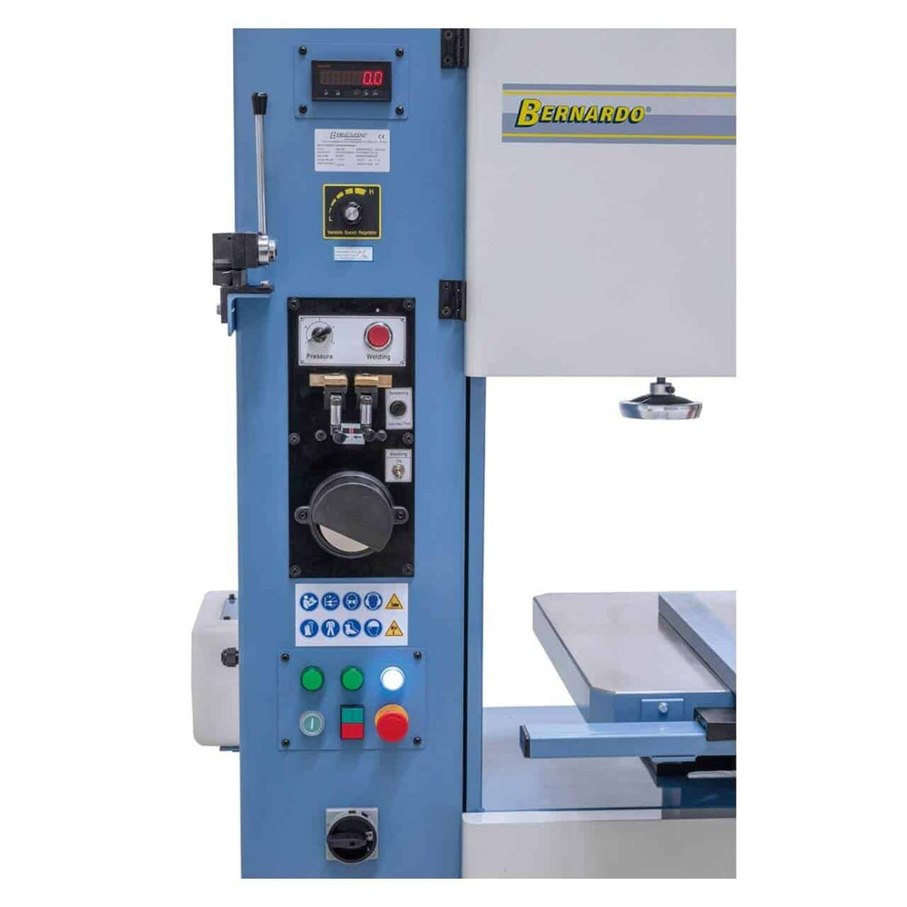La Bernardo VBS 400 è una sega a nastro verticale professionale, progettata per lavorazioni di precisione su metallo e materiali sagomati. Dotata di tavolo in ghisa massiccia inclinabile in 4 direzioni (-15° a +45°), assicura stabilità e sicurezza durante il lavoro. Grazie al display LED, la regolazione continua della velocità di taglio (15–260 m/min) è semplice e precisa, adattandosi a diversi materiali e spessori. Tra le dotazioni standard figurano la saldatrice lama con ricottura, cesoia e mola integrata, che permettono di preparare e rigenerare le lame direttamente in macchina. La VBS 400 è inoltre equipaggiata con microrefrigerazione, guida parallela e guida angolare, rendendola perfetta anche per tagli complessi e forme irregolari. Con capacità di taglio fino a 400 mm in larghezza e 280 mm in altezza, motore da 1,5 kW e struttura robusta da 325 kg, rappresenta una soluzione compatta, efficiente e affidabile per officine e carpenterie.
