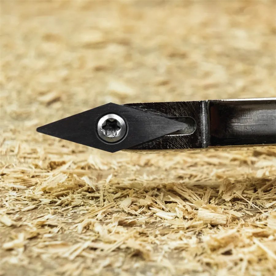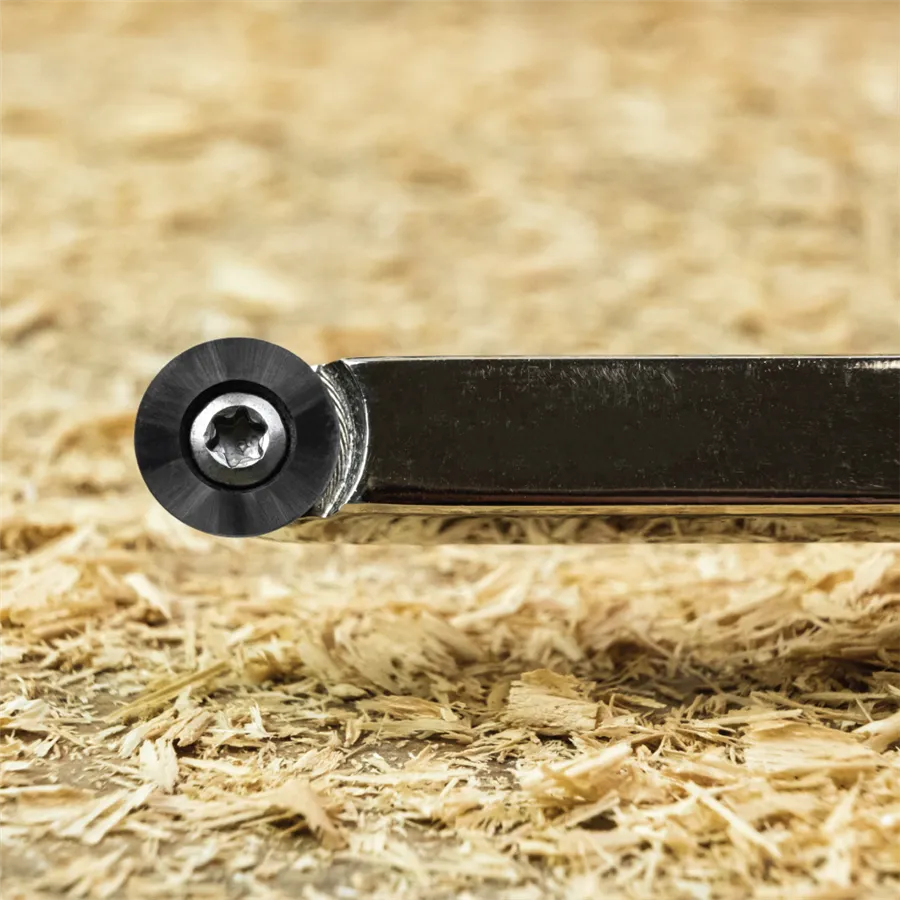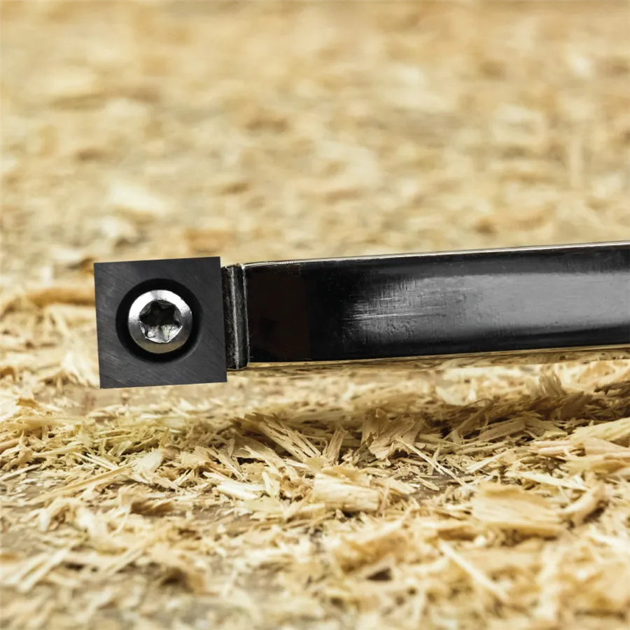 Il Set di Scalpelli con Punta Sostituibile Cromati include 4 scalpelli dotati di quattro tipi di punte – quadrata, a raggio, tonda e a diamante. La punta quadrata è utilizzata per la sgrossatura del materiale e la realizzazione di tenoni, la punta a raggio può essere impiegata anch'essa per sgrossare il materiale e creare tenoni arrotondati. La punta tonda è adatta per la sgrossatura o la modellazione di curve. Con la punta a diamante è possibile realizzare scanalature e altri dettagli. La punta in carburo di lunga durata non necessita di essere affilata; quando diventa opaca, è sufficiente ruotarla. La punta deve essere sostituita non appena il bordo risulta consumato su tutti i lati.