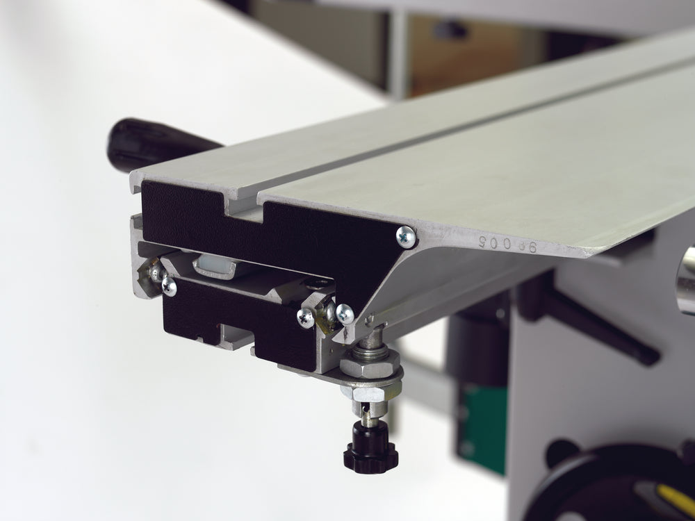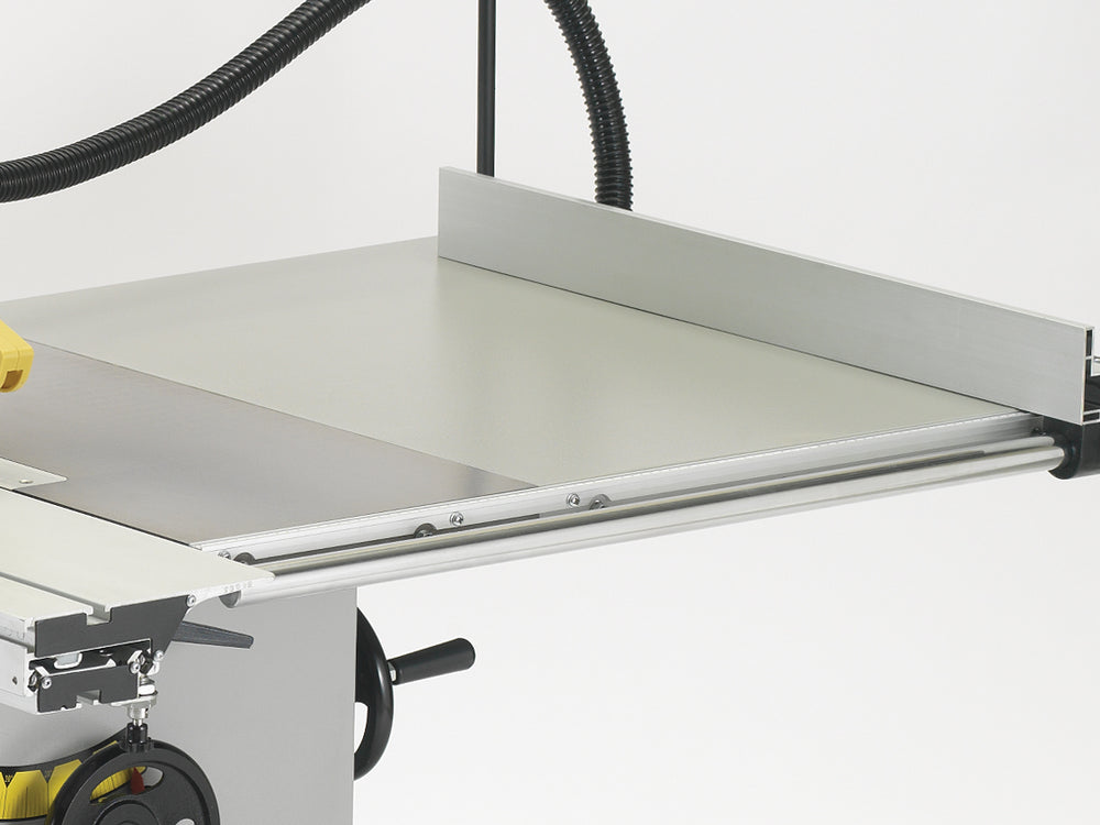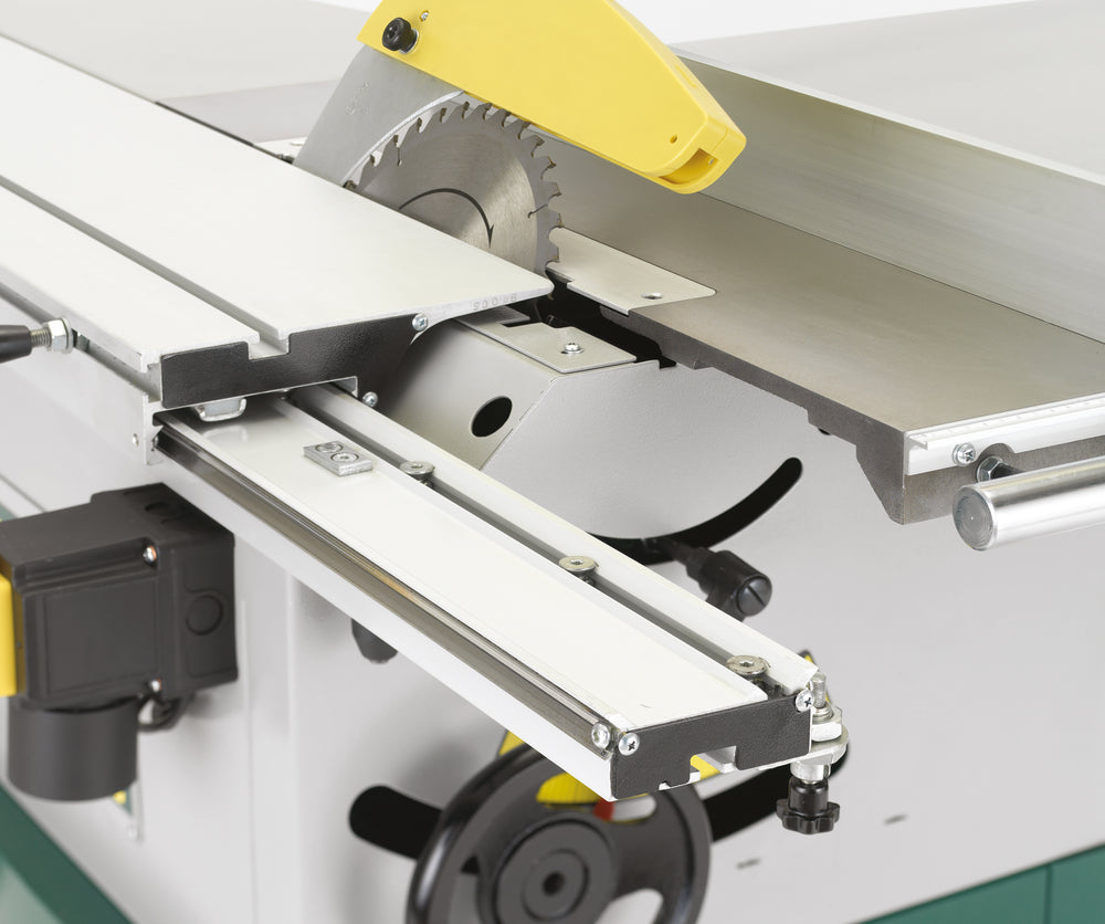 Il carrello a squadrare da 1320 x 238 mm, scorrevole e preciso, semplifica il taglio dei pannelli e delle grandi superfici. La struttura in acciaio riduce le vibrazioni, mentre il motore da 2 HP (1500 W) garantisce potenza costante anche su materiali duri.