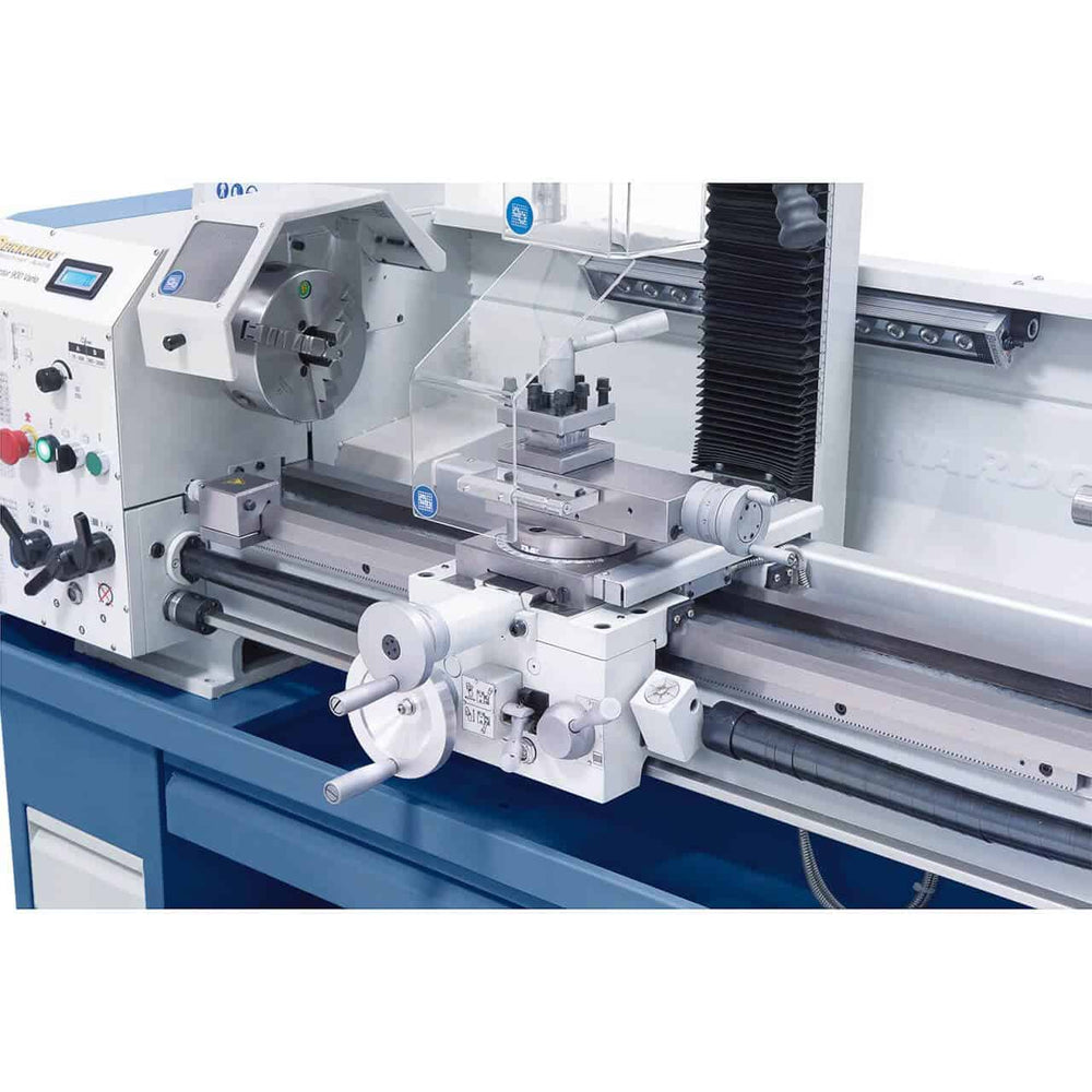 Il centro di lavoro Bernardo Proficenter 900 Vario / 400 V è una macchina combinata tornio-fresatrice progettata per professionisti e laboratori che necessitano massima versatilità in spazi ridotti. Con un passaggio barra da 38 mm e bancale temprato a induzione, il tornio garantisce precisione e robustezza nelle lavorazioni di acciaio, metalli non ferrosi e plastica. L’inverter consente regolazione continua della velocità (75–2000 giri/min), mentre il visualizzatore digitale 2 assi ES-12 V semplifica le lavorazioni complesse. La fresatrice integrata offre capacità di foratura fino a 20 mm, testina inclinabile ±90° e regolazione continua della velocità fino a 2250 rpm. Completo di mandrino autocentrante, mandrino portapunte, torretta portautensili e numerosi accessori, rappresenta una soluzione compatta e professionale per officine meccaniche e formazione tecnica.