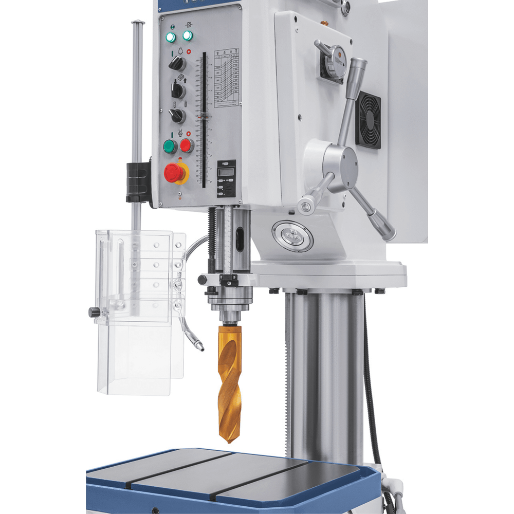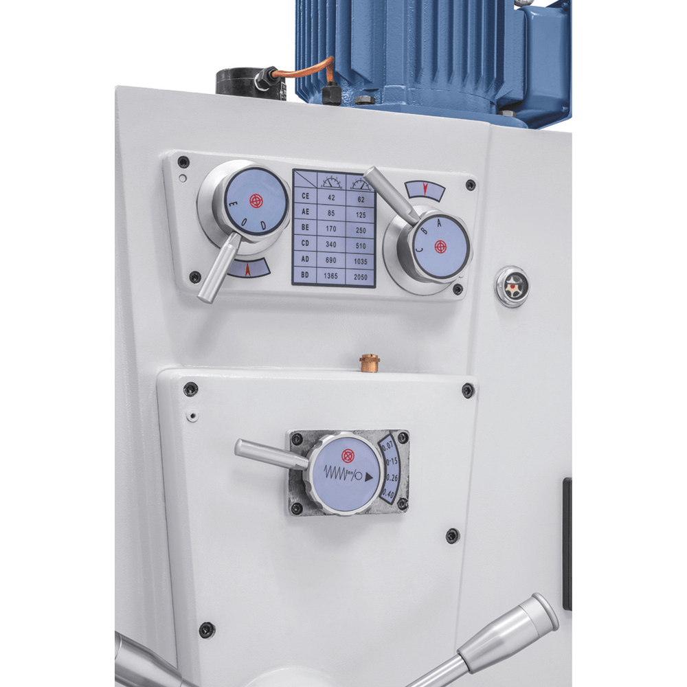 Gli ingranaggi temprati e rettificati assicurano trasmissione fluida e lunga durata, mentre le 12 gamme di velocità da 42 a 2050 giri/min consentono di adattarsi perfettamente a diversi materiali e utensili. Il modello include di serie 4 avanzamenti automatici del mandrino tramite frizione elettromagnetica, oltre al dispositivo di filettatura e allo sgancio automatico utensile. La solida tavola girevole a 360° e inclinabile da -45° a +45° aumenta la versatilità, mentre la pompa di refrigerazione integrata e la lampada LED garantiscono sicurezza e precisione anche in uso continuo.