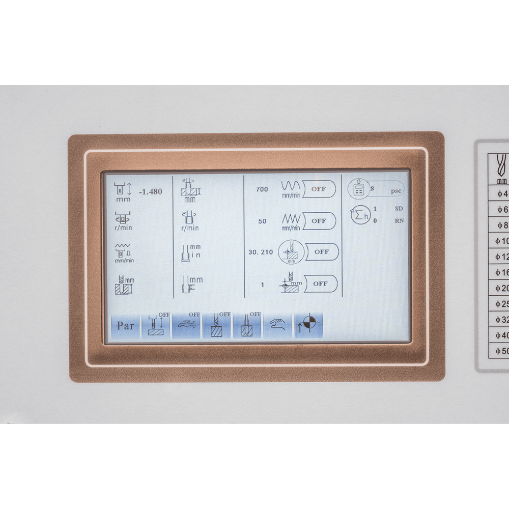 • Ampio touchscreen per la gestione di tutte le funzioni operative (foratura, fori profondi, filettatura, ecc.)