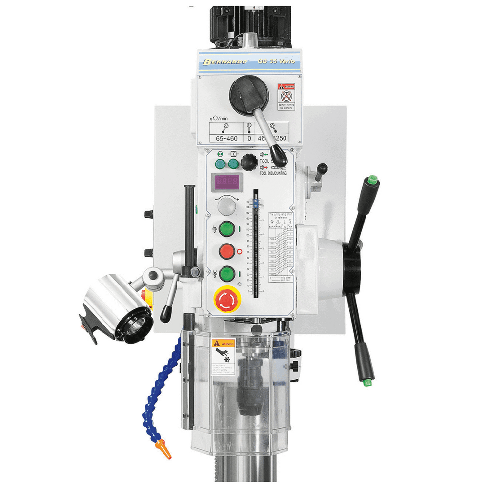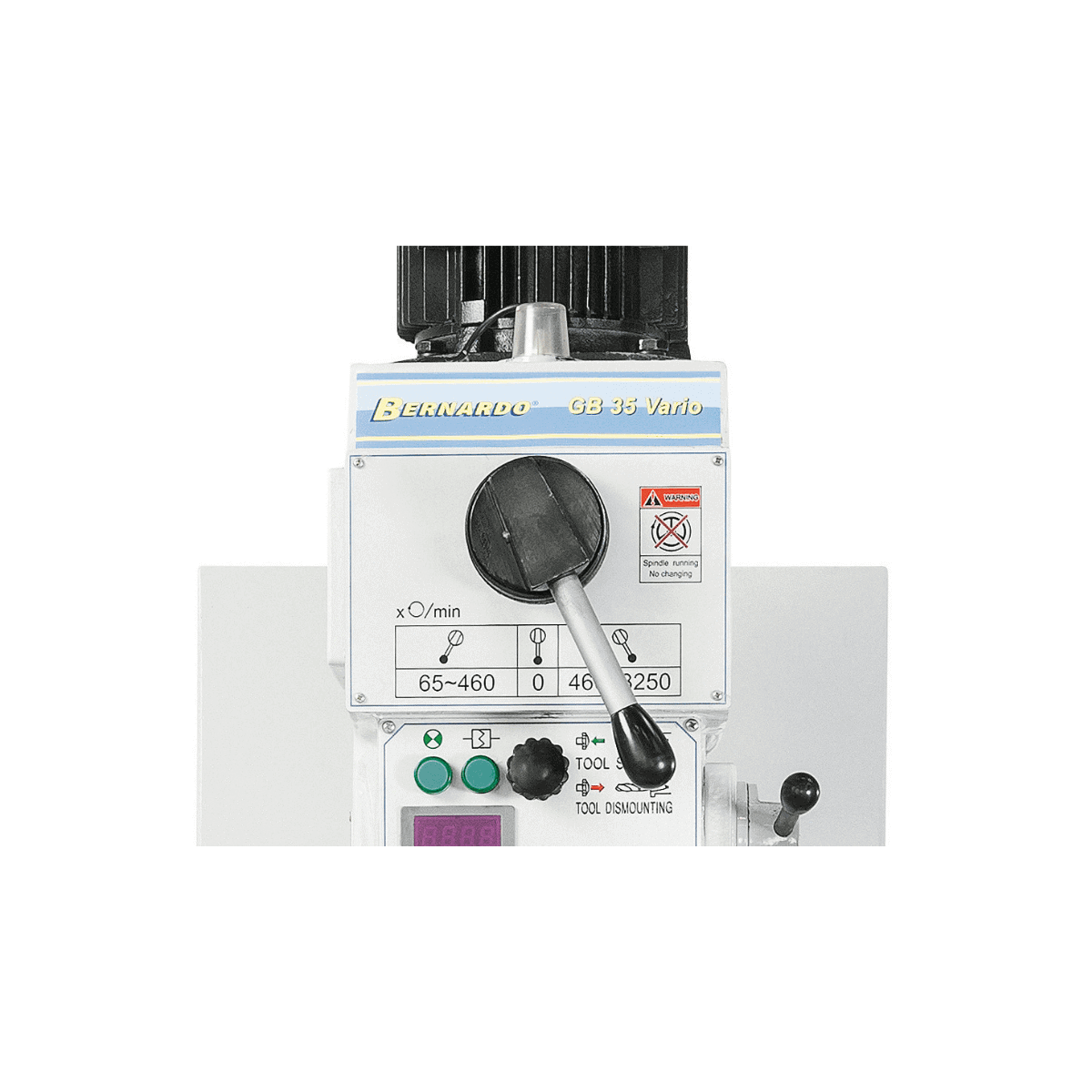 Il trapano a colonna Bernardo GB 35 Vario è una macchina compatta e robusta, progettata per forature, alesature e filettature fino a M24. La regolazione continua della velocità (65–3250 rpm) garantisce l’adattamento ottimale a ogni materiale, mentre il display digitale rende semplice il controllo operativo.