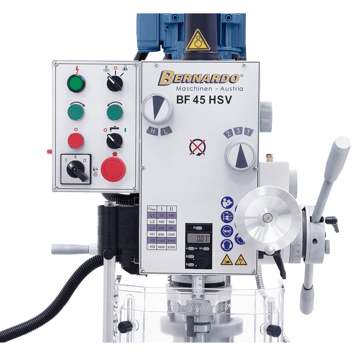 Dotata di protezione regolabile con microinterruttore, display digitale della corsa mandrino, pompa di refrigerazione e luce LED, la BF 45 HSV è una macchina completa e sicura, ideale per officine e laboratori meccanici.