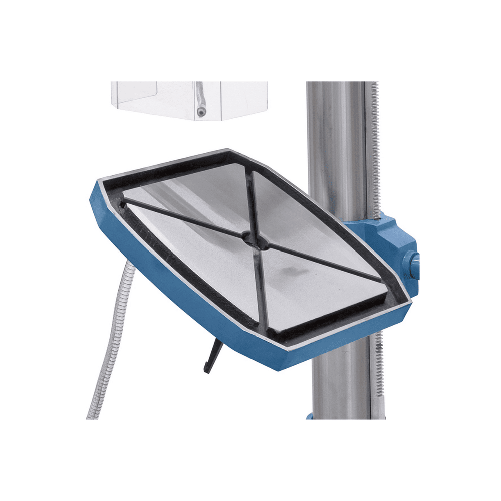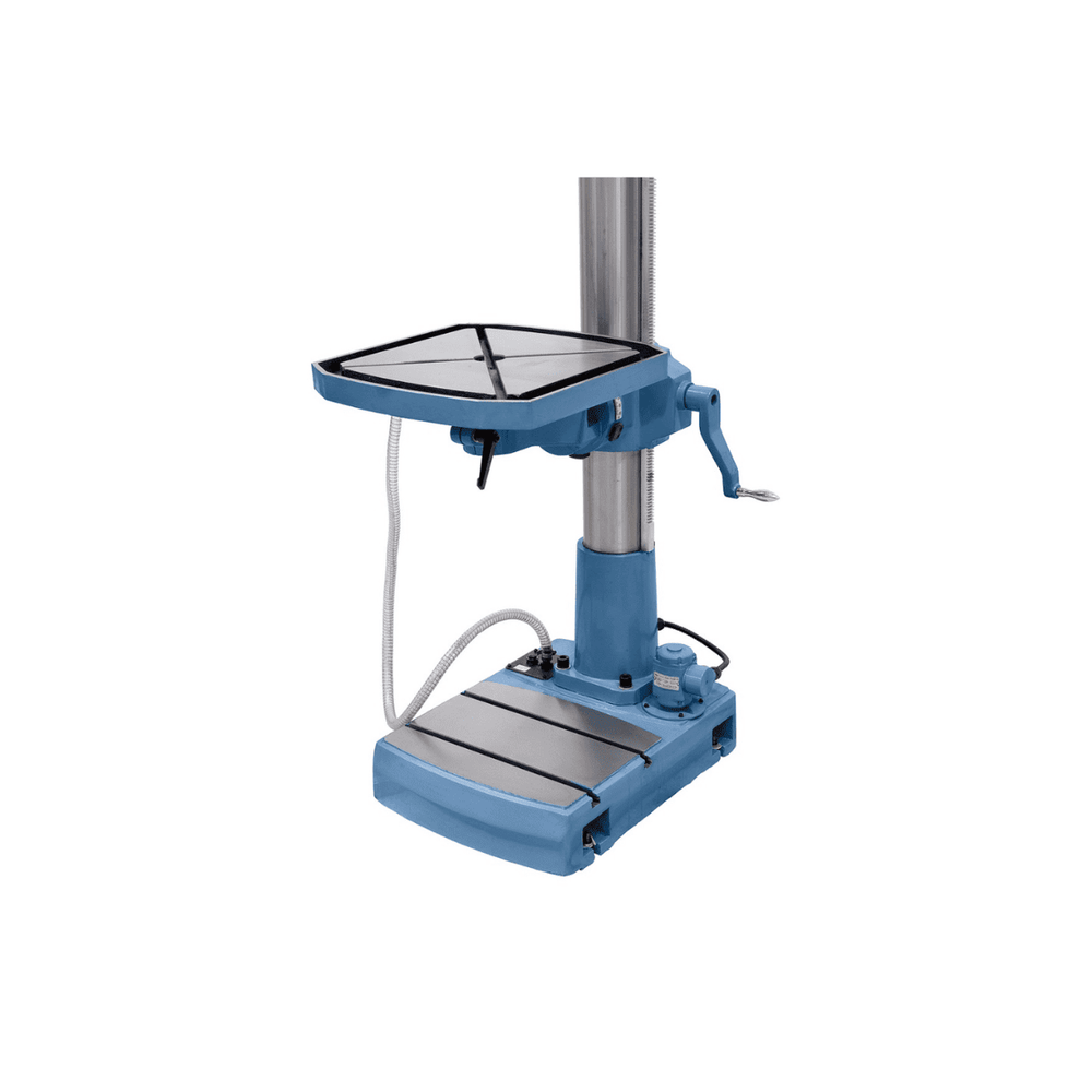 Il trapano è dotato di avanzamenti automatici del mandrino (3 step), dispositivo di filettatura e sgancio automatico utensile. La tavola in ghisa massiccia da 460 x 460 mm è girevole e inclinabile, mentre la base trattata con pompa di refrigerazione integrata assicura stabilità e sicurezza.