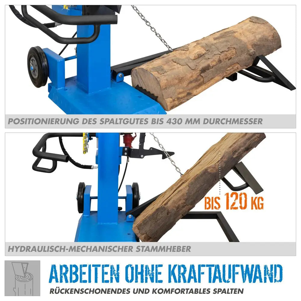 Dotato di sollevatore idraulico-meccanico per i tronchi pesanti, consente un lavoro ergonomico senza sforzi fisici. Il coltello di spacco in acciaio speciale parzialmente temprato garantisce lunga durata, mentre i due livelli di velocità permettono di ottimizzare i tempi di lavoro.