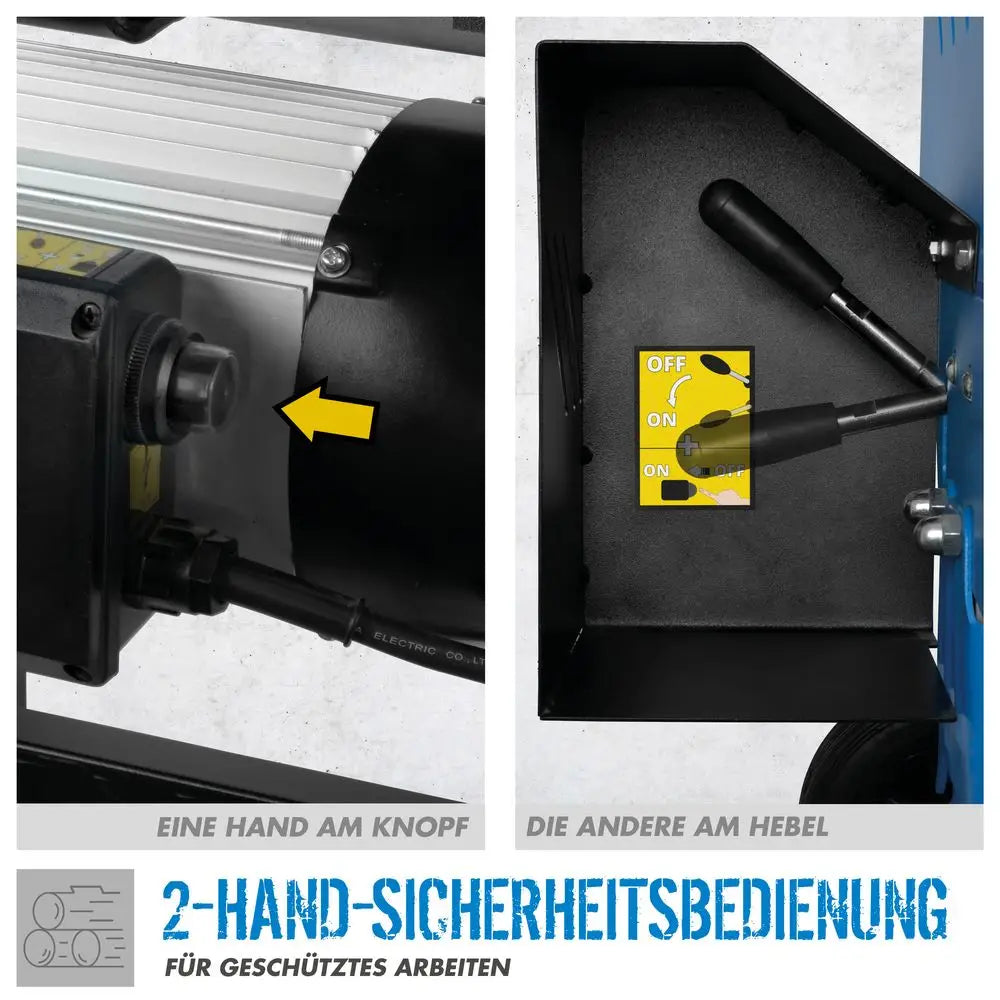 Grazie al telaio di base rialzato, lo spaccalegna offre una altezza di lavoro ergonomica di 1070 mm, riducendo l'affaticamento durante l’utilizzo. Il sistema di sicurezza a due mani, la protezione dell’area di spacco e il tavolo di appoggio stabile garantiscono la massima sicurezza e un utilizzo conforme agli standard moderni.